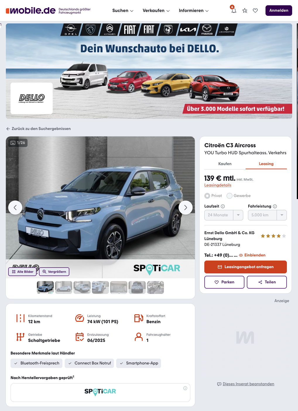 Kompaktes Familien-SUV mit entspanntem Komfort und erstaunlich viel Flex im Alltag. Citroën C3 Aircross PureTech 100 YOU bei mobile.de für 139 Euro brutto pro Monat, mit Tageszulassung von Juni 2025 (nur 12 km), bei 24 Monaten Laufzeit und 5.000 km pro Monat. Das SUV kommt in Montecarlo-Blau und bietet viel Komfort, typisch Citroën.
