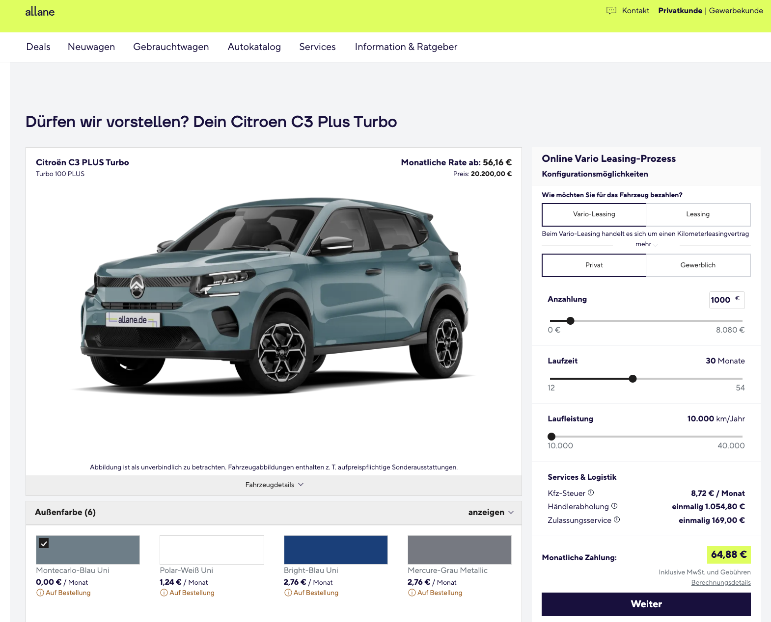 Das Angebot wurde mit 30 Monaten Laufzeit und 10.000 Kilometern pro Jahr kalkuliert, kann jedoch individuell angepasst werden. Wer lieber ein klassisches Leasing ohne Rückkaufoption bevorzugt, bekommt den Citroën C3 in gleicher Kalkulation auch für 83,46 Euro brutto pro Monat. Damit entsteht ein besonders günstiges Angebot für alle, die einen unkomplizierten Kleinwagen mit moderner Technik suchen.