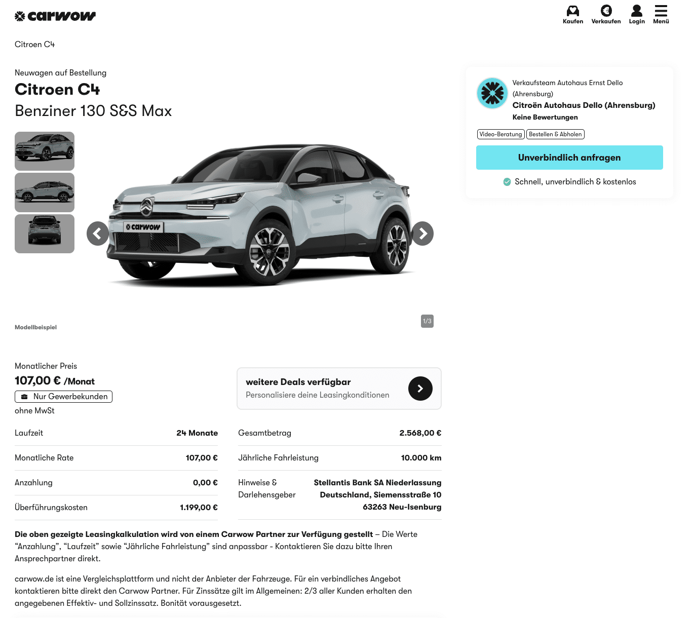 Bei carwow gibt es aktuell ein Angebot, das aufhorchen lässt: Geschäftskunden können den Citroën C4 PureTech 130 S&S in der Ausstattungslinie MAX für nur 107 Euro netto im Monat leasen. Ein frei konfigurierbares Bestellfahrzeug, das euch die Wahl lässt, von der Lackierung bis zu den Ausstattungspaketen.