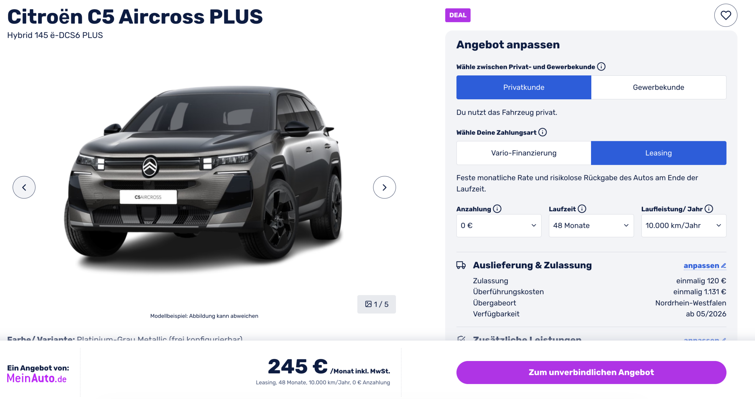 Geräumig, komfortabel und überraschend günstig, ein echter Citroën eben. Der Citroën C5 Aircross Hybrid 145 ë-DCS6 PLUS in der PLUS-Ausstattung ist bei MeinAuto aktuell für preiswerte 245 Euro brutto im Monat zu haben. Nach 48 Monaten Laufzeit und 10.000 Kilometern pro Jahr geht das Auto unkompliziert an den Leasinggeber zurück.
