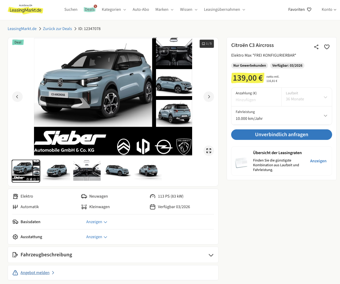 Kalkuliert ist das Leasing mit 36 Monaten Laufzeit und 10.000 Kilometern pro Jahr, Anpassungen sind möglich. Interessant ist der Abstand im Markt, denn der Platzhirsch liegt für den ë C3 Aircross bei 257 Euro netto pro Monat, also deutlich über diesem Deal.