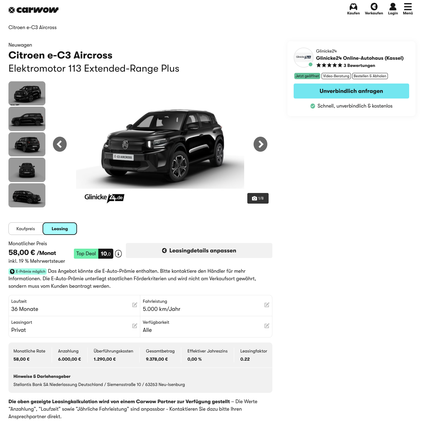 Kompakt, elektrisch und überraschend erwachsen im Auftritt, der Citroën ë‑C3 Aircross. Privatkunden können jetzt den Citroën ë-C3 Aircross in der Variante 113 Extended-Range Plus bei carwow für 58 Euro brutto pro Monat leasen, kalkuliert mit einer Sonderzahlung von 6.000 Euro in Form der Umweltprämie. Angeboten wird ein bereits bestelltes Fahrzeug, die Lieferzeit liegt realistisch bei zwei bis drei Monaten.