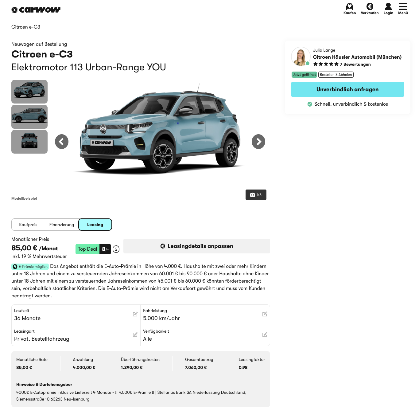 Klein, frech und genau da zuhause, wo Parklücken rar sind. Den Citroën ë-C3 113 Urban-Range YOU gibt es bei carwow aktuell für 85 Euro brutto pro Monat im Leasing, bei einer Anzahlung von 4.000 Euro als Umweltprämie. Angeboten wird ein frei konfigurierbares Bestellfahrzeug mit einer Lieferzeit von rund drei Monaten.