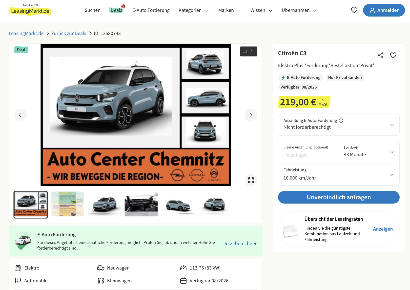 Ein Blick auf den Markt zeigt schnell, wie attraktiv dieses Angebot ist. Während der Marktführer für den ë-C3 rund 337 Euro brutto im Monat verlangt, bleibt LeasingMarkt mit 219 Euro monatlich deutlich darunter. In Kombination mit der fehlenden Anzahlung und den klar kalkulierten 48 Monaten Laufzeit bei 10.000 Kilometern jährlich entsteht ein Angebot, das Elektromobilität einfach und planbar macht.