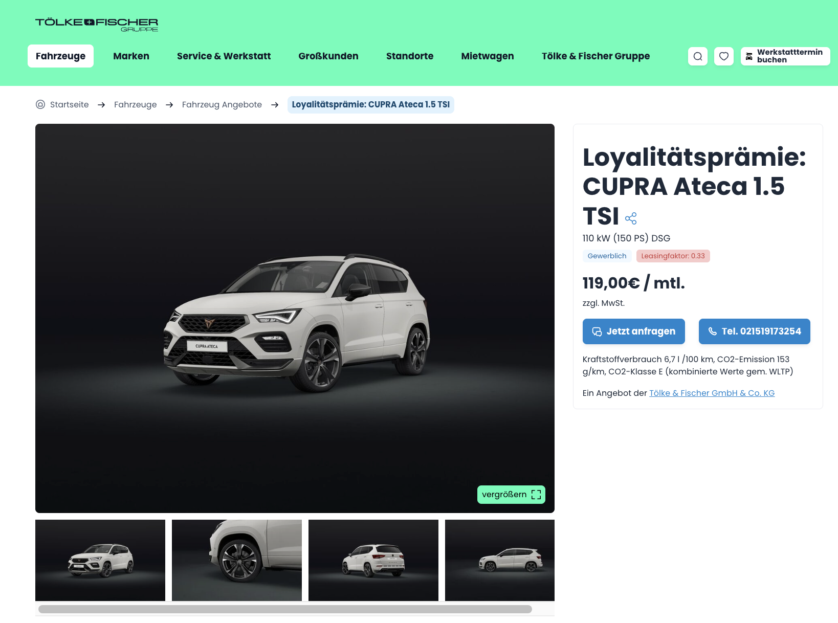Kompaktes Performance SUV zum Black-Leaisng-Preis. Cupra Ateca 1.5 TSI ACT 110 kW DSG bei Tölke+Fischer für 119 Euro netto im Monat im Geschäftsleasing, inklusive Loyalitätsprämie, wenn bereits ein SEAT oder CUPRA seit mindestens sechs Monaten auf euch zugelassen ist, egal ob gekauft, geleast oder finanziert.