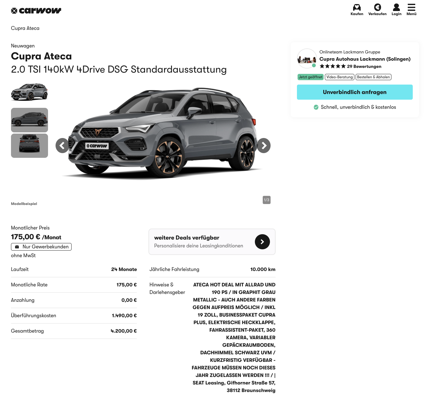 Noch schnell ein Schnäppchen am Jahresende machen? Bei carwow wartet der Cupra Ateca 2.0 TSI 140kW 4Drive DSG für nur 175 Euro netto pro Monat auf Geschäftskunden. Sofort verfügbar in Graphit Grau Metallic, andere Farben sind gegen Aufpreis möglich. Das Fahrzeug kommt mit üppiger Sonderausstattung, wichtig ist nur, dass die Zulassung noch in 2025 erfolgt.