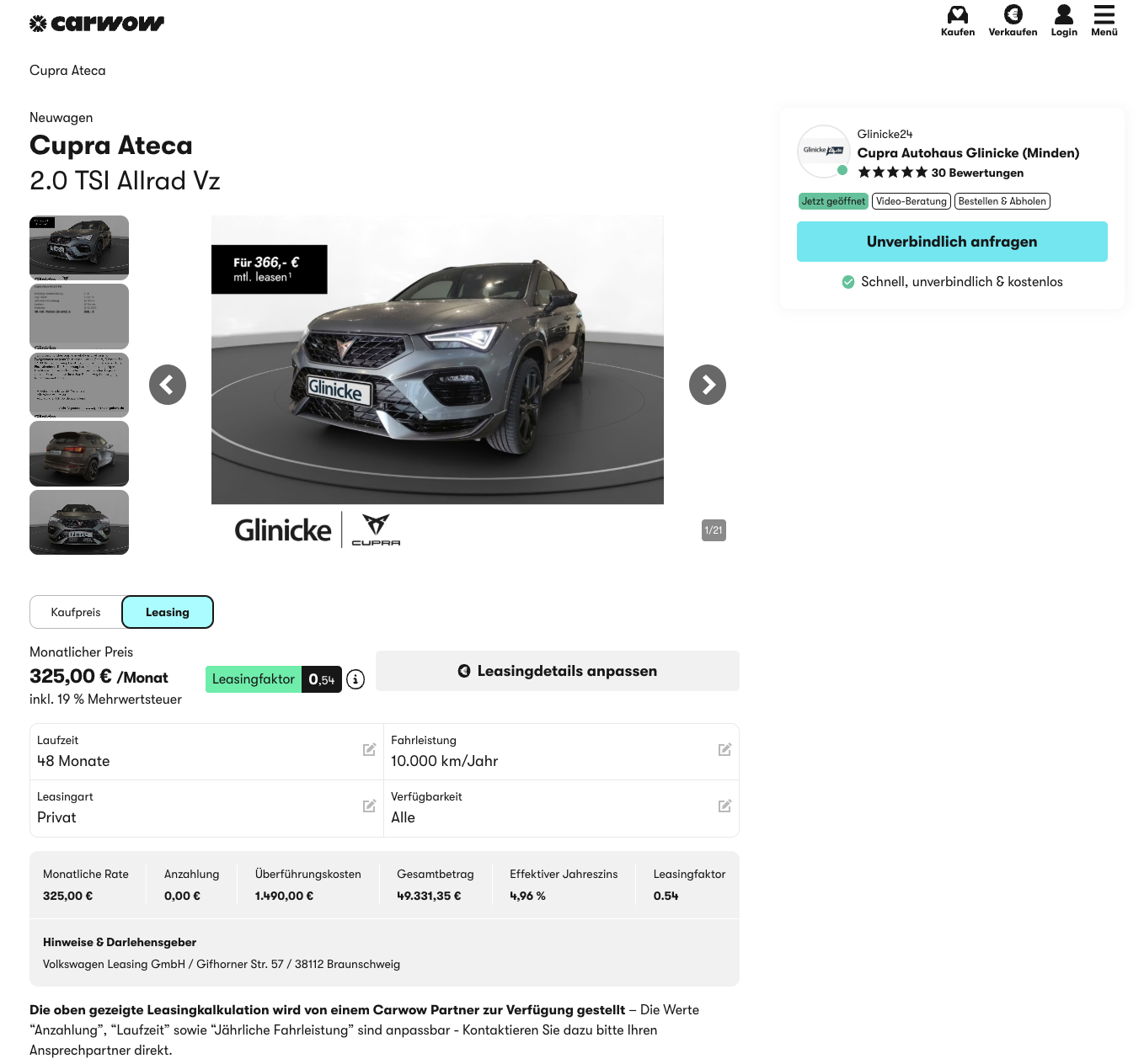 Ein SUV mit ordentlich Performance. Den Cupra Ateca VZ 2.0 TSI 221 kW 4Drive DSG gibt es bei carwow für 325 Euro brutto im Monat im Privatleasing. Das Fahrzeug ist bereits bestellt und kurzfristig verfügbar in Graphite Grau Metallic.