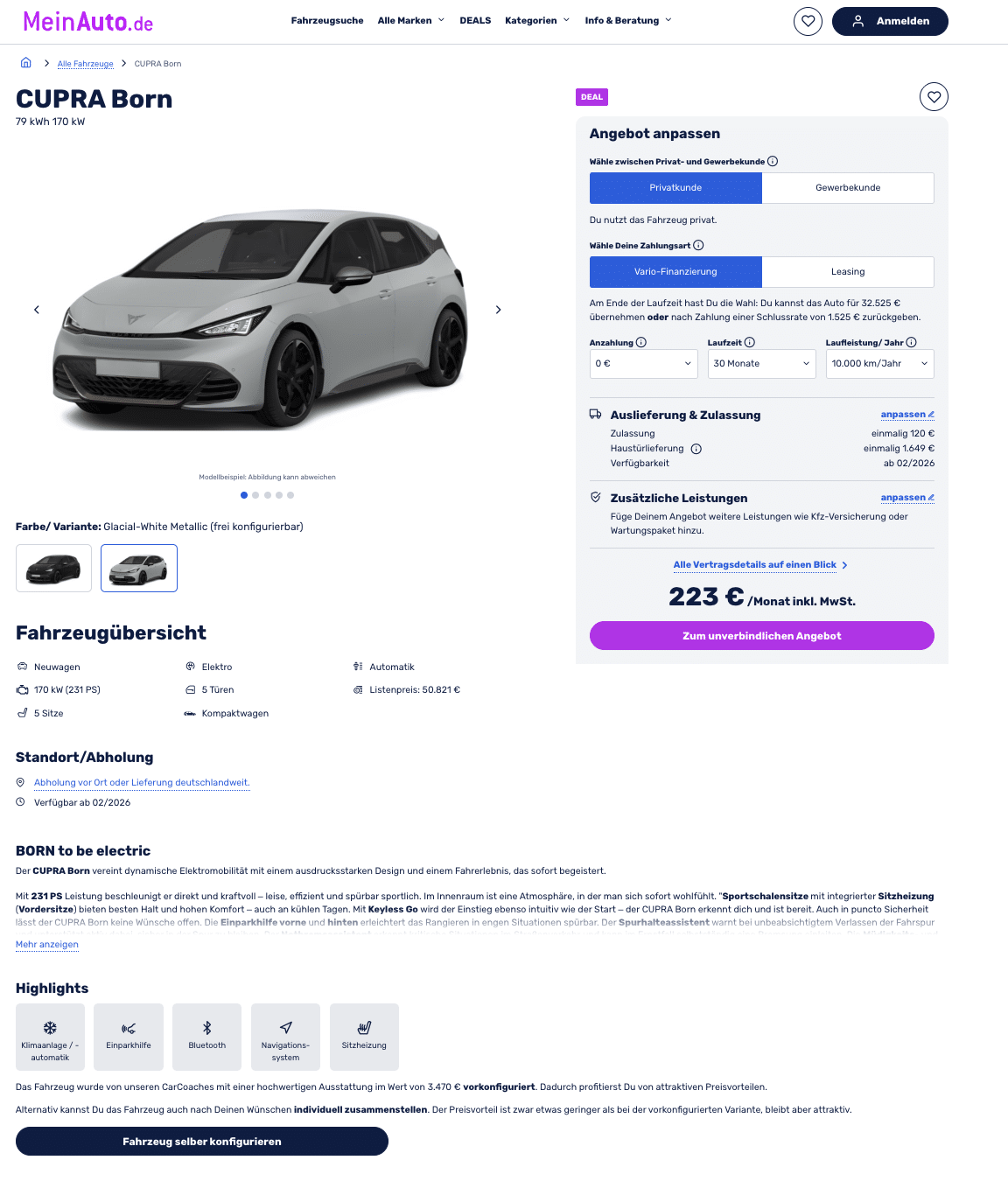 Elektro fahren mit klarer Kostenkontrolle! Bei MeinAuto sichert ihr euch den Cupra Born mit großem 79 kWh-Akku und 170 kW (231 PS) für 223 Euro brutto pro Monat im Vario-Leasing. Nach Ablauf entscheidet ihr flexibel: übernehmen für 32.525 Euro oder nach Schlussrate von 1.525 Euro einfach zurückgeben. Wer klassisch rechnen will, bekommt den Born alternativ für 273 Euro brutto pro Monat im regulären Leasing. Das Fahrzeug ist vorkonfiguriert (Auslieferung Februar 2026), auf Wunsch lässt es sich individuell anpassen.