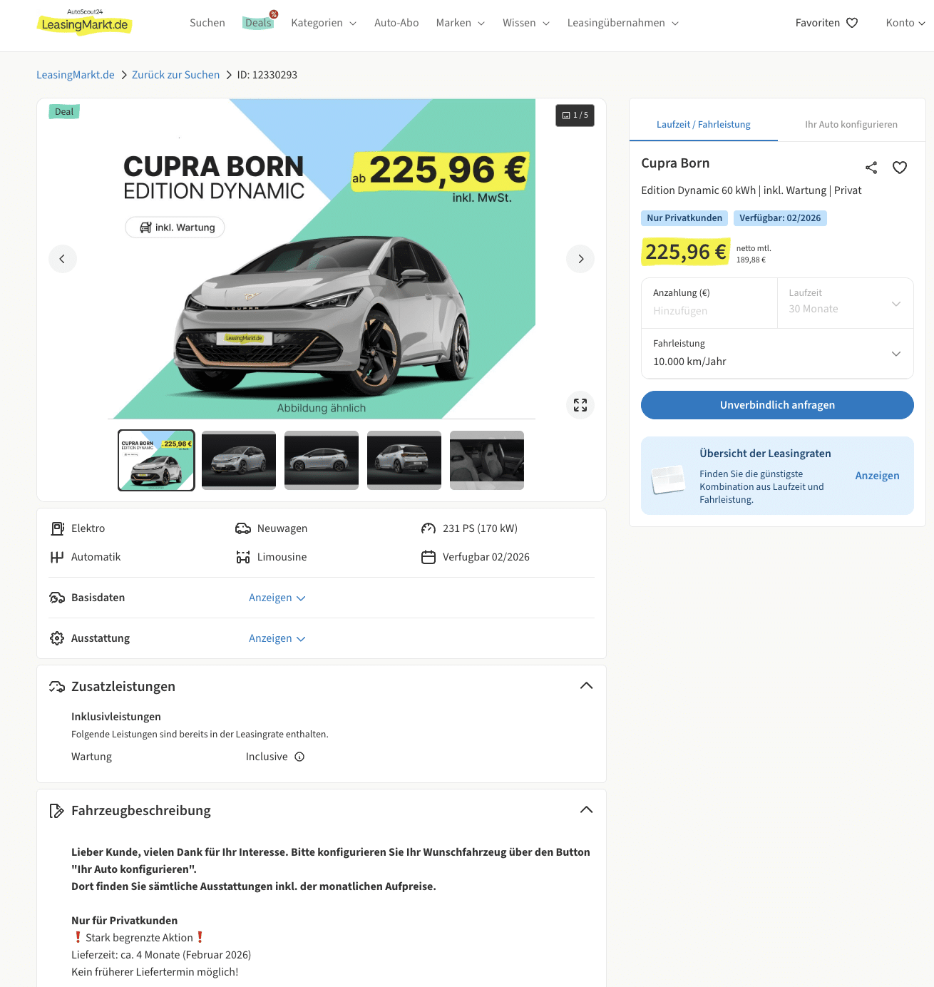 Elektrisch, emotional, effizient. Der CUPRA Born als Edition Dynamic meistert den Spagat aus Fahrspaß und Alltagstauglichkeit. Für 225,96 Euro brutto im Monat geht’s ins Privatleasing, inklusive für Service-Paket, das die Wartungsarbeiten beinhaltet. Weil es sich um ein frei konfigurierbares Bestellfahrzeug handelt, bestimmt ihr Lack, Räder und Pakete selbst. Wichtig: stark limitierte Aktion, Lieferzeit ca. vier Monate (Februar 2026).