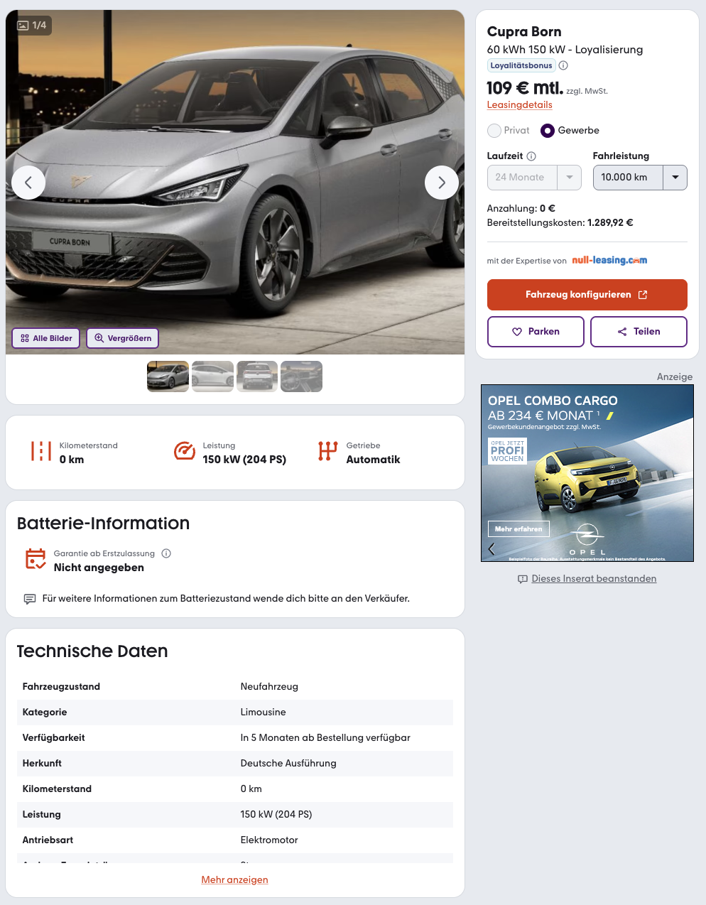 Das Angebot ist auf 24 Monate und 10.000 Kilometer pro Jahr ausgelegt, Anpassungen der Kilometer sind möglich. Im Vergleich zeigt sich, wie saftig der Deal wirklich ist, beim Marktführer kostet der Cupra Born ohne Prämie 313 Euro netto im Monat, hier steht ihr mit 109 Euro netto inklusive Loyalitätsvorteil in der Liste. Zum Tag der Gewürzgurke gibt es damit kein Gurken-Auto, sondern einen sportlichen Elektro Cupra mit knackiger Rate und echtem Fahrspaß.