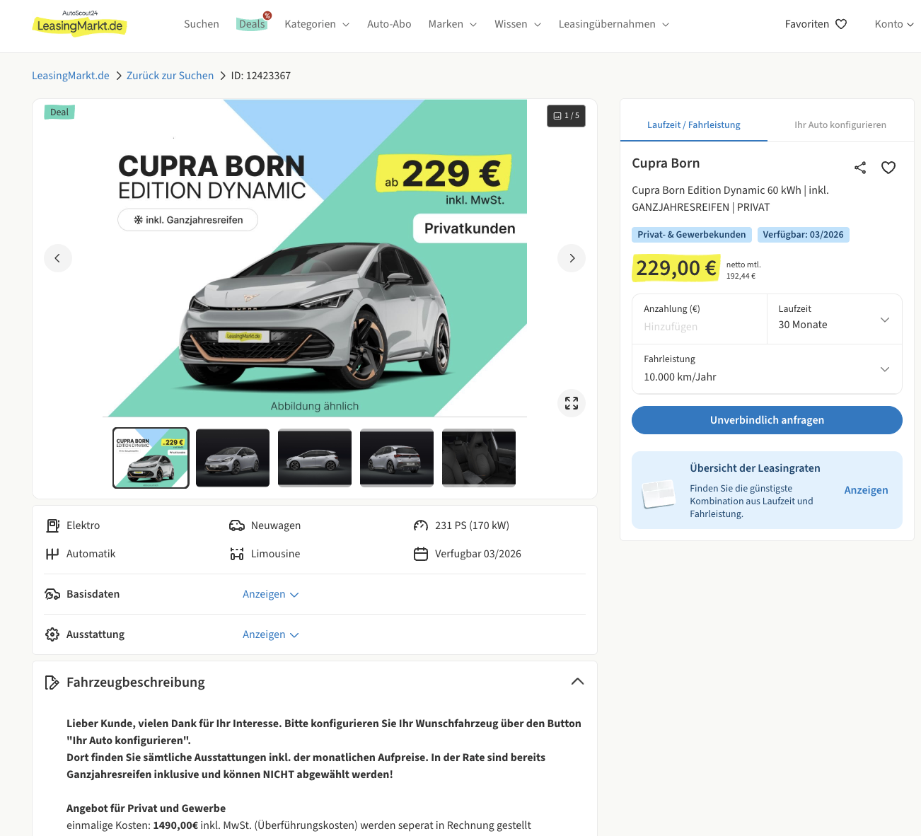 Das Angebot ist auf 30 Monate und 10.000 Kilometer pro Jahr ausgelegt, beides kann angepasst werden. Im Vergleich dazu verlangt der Marktführer im Segment 370 Euro brutto pro Monat für einen ähnlich ausgestatteten Born, der Preisvorteil dieser Black Friday Aktion ist also deutlich spürbar.