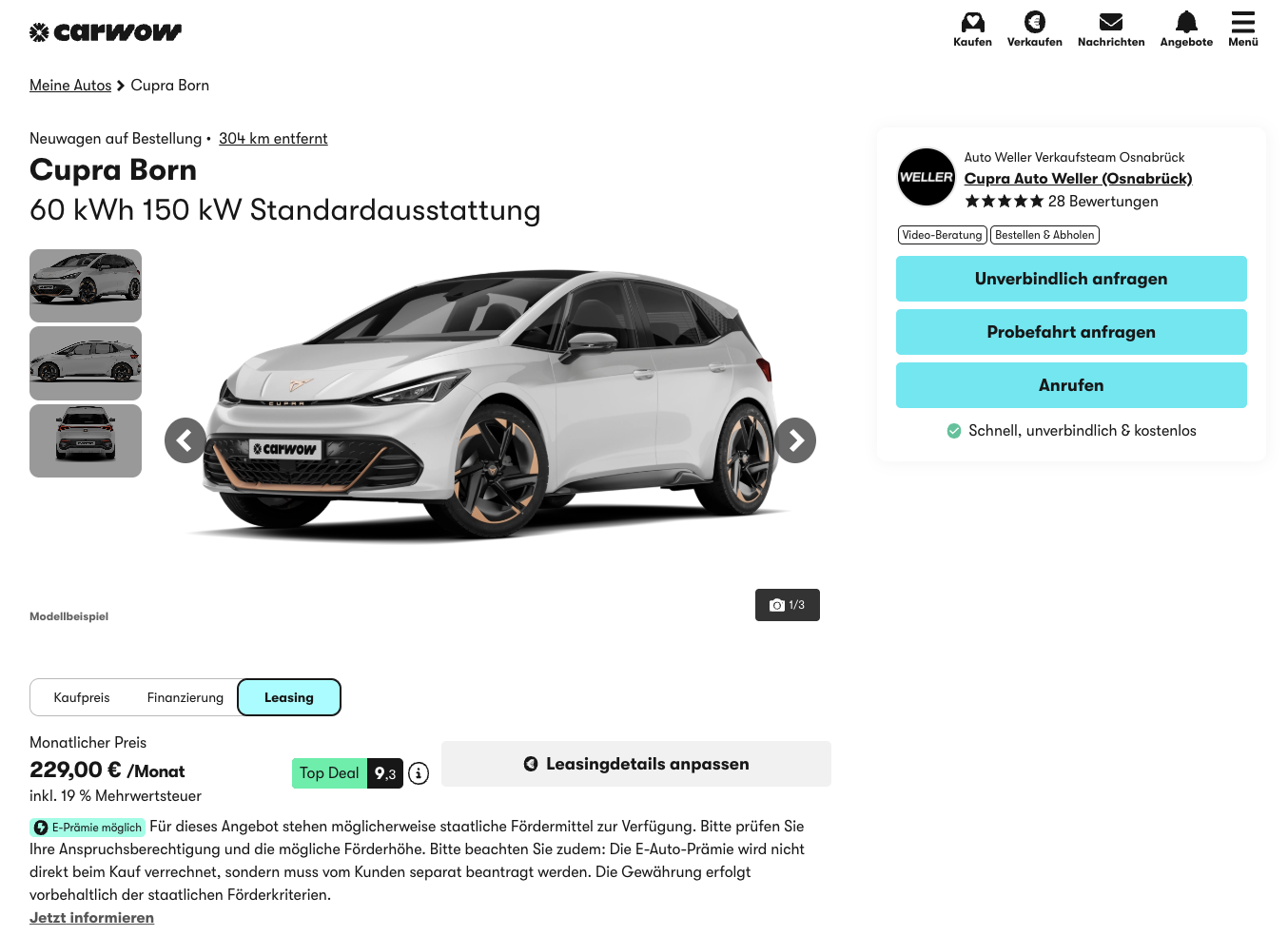 Cupra Born Leasing für 229 [340] Euro im Monat brutto [Umwelt]