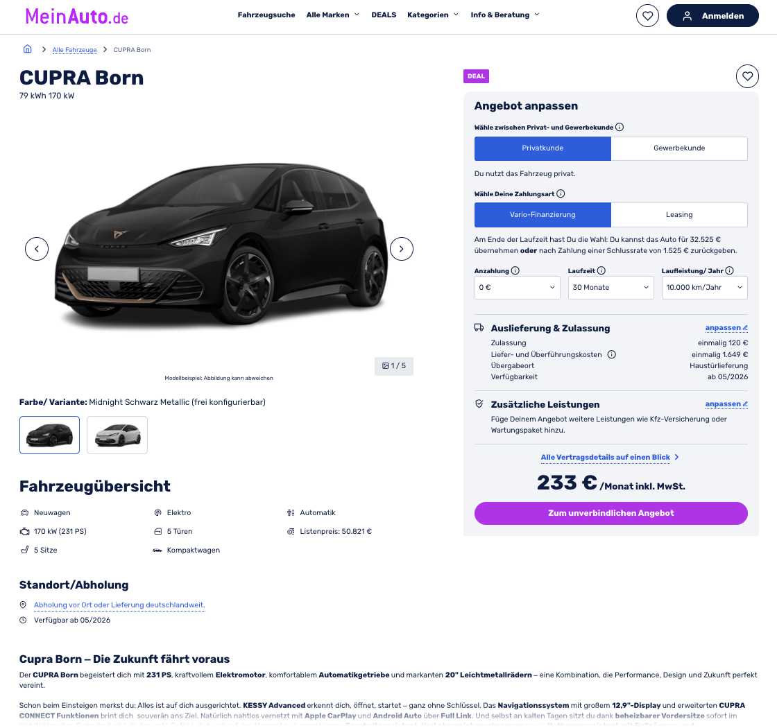 Sportlich, leise und im Alltag überraschend erwachsen. MeinAuto haut den Cupra Born 79 kWh 170 kW für 233 Euro im Monat brutto raus. Am Ende des Vario-Leasings entscheidet ihr selbst, ob ihr den Born für 32.525 Euro übernehmen wollt oder ihn nach Zahlung einer Schlussrate von 1.525 Euro zurückgebt. Dazu kommt ein weiterer Pluspunkt: Es handelt sich um ein frei konfigurierbares Bestellfahrzeug, ihr könnt euch den Cupra also passend zu eurem Fahrprofil zusammenstellen, vom Look bis zu den Komfortdetails.