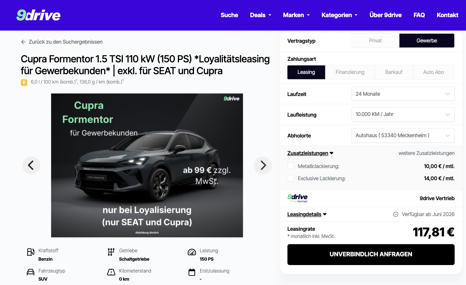 Cupra Formentor zum Kampfpreis, sportliches SUV für unter 100 Euro im Monat! Sichert euch den Cupra Formentor 1.5 TSI bei 9Drive für nur 99 Euro netto im Monat. Damit steht ein Kompakt-SUV mit markantem Auftritt zu einer Leasingrate bereit, die im Markt aktuell heraussticht. Kalkuliert wurde das Angebot inklusive Loyalitätsprämie, die sich an Fahrer richtet, die seit mindestens sechs Monaten einen SEAT oder CUPRA besitzen oder leasen. Mit einem Leasingfaktor von nur 0,28 bewegt sich der Deal in einem außergewöhnlich attraktiven Bereich. Gleichzeitig handelt es sich um ein frei konfigurierbares Bestellfahrzeug, sodass Ausstattung und Farbe individuell zusammengestellt werden können. Die Verfügbarkeit ist ab Juni 2026 vorgesehen.