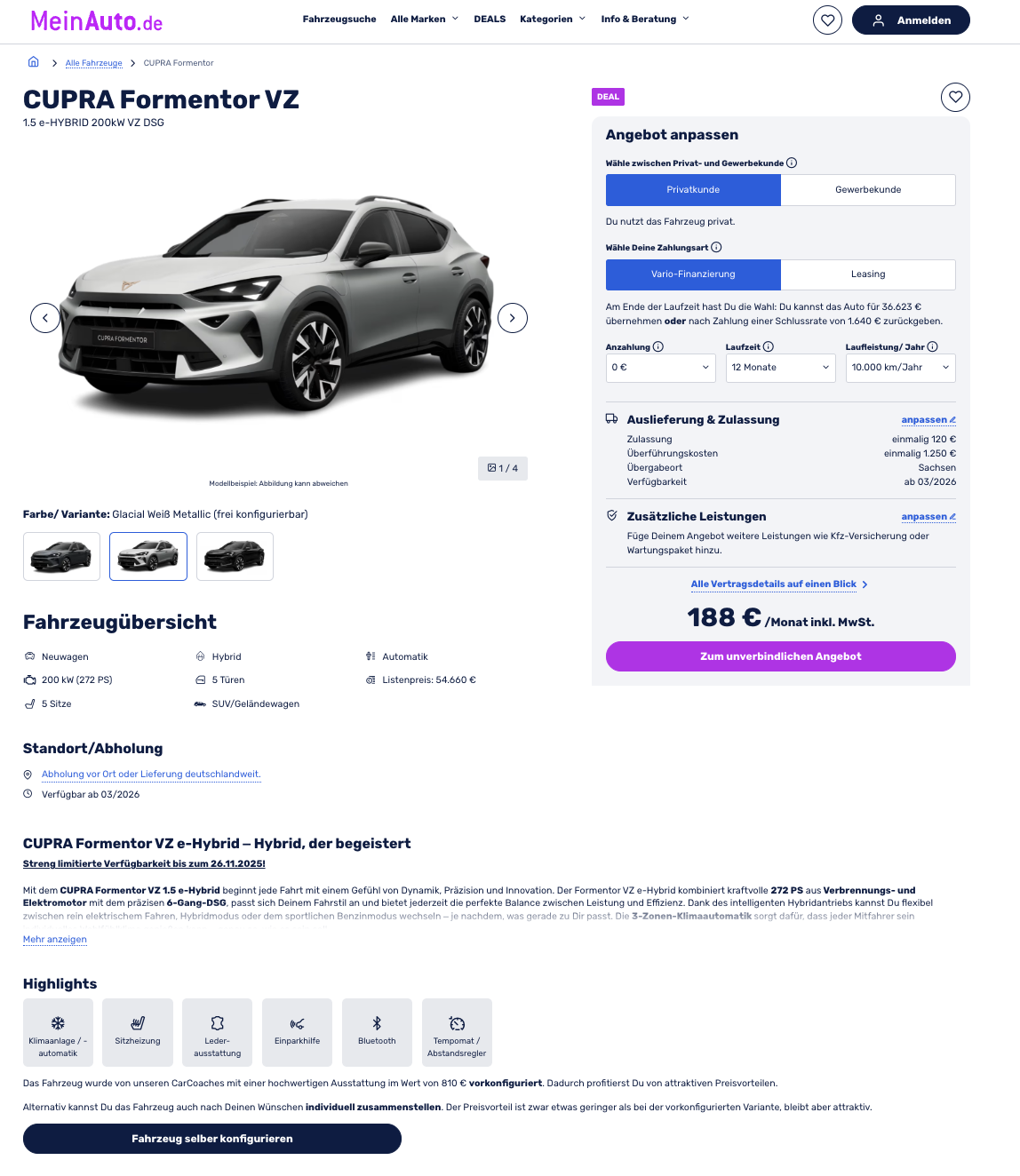 Sportliches Plug-in-SUV mit echter E-Reichweite zum Kampfpreis. Den Cupra Formentor VZ 1.5 e-Hybrid 200 kW DSG gibt es bei MeinAuto im Vario-Leasing für nur 188 Euro im Monat brutto, frei konfigurierbar vom Lack bis zu den Paketen, mit geplanter Verfügbarkeit ab März 2026. Am Ende der Laufzeit bleibt ihr flexibel, ihr könnt den Formentor für 36.623 Euro übernehmen oder ihn nach Zahlung einer Schlussrate von 1.640 Euro wieder abgeben, je nachdem, wie gut er in euren Fuhrpark oder Alltag passt.