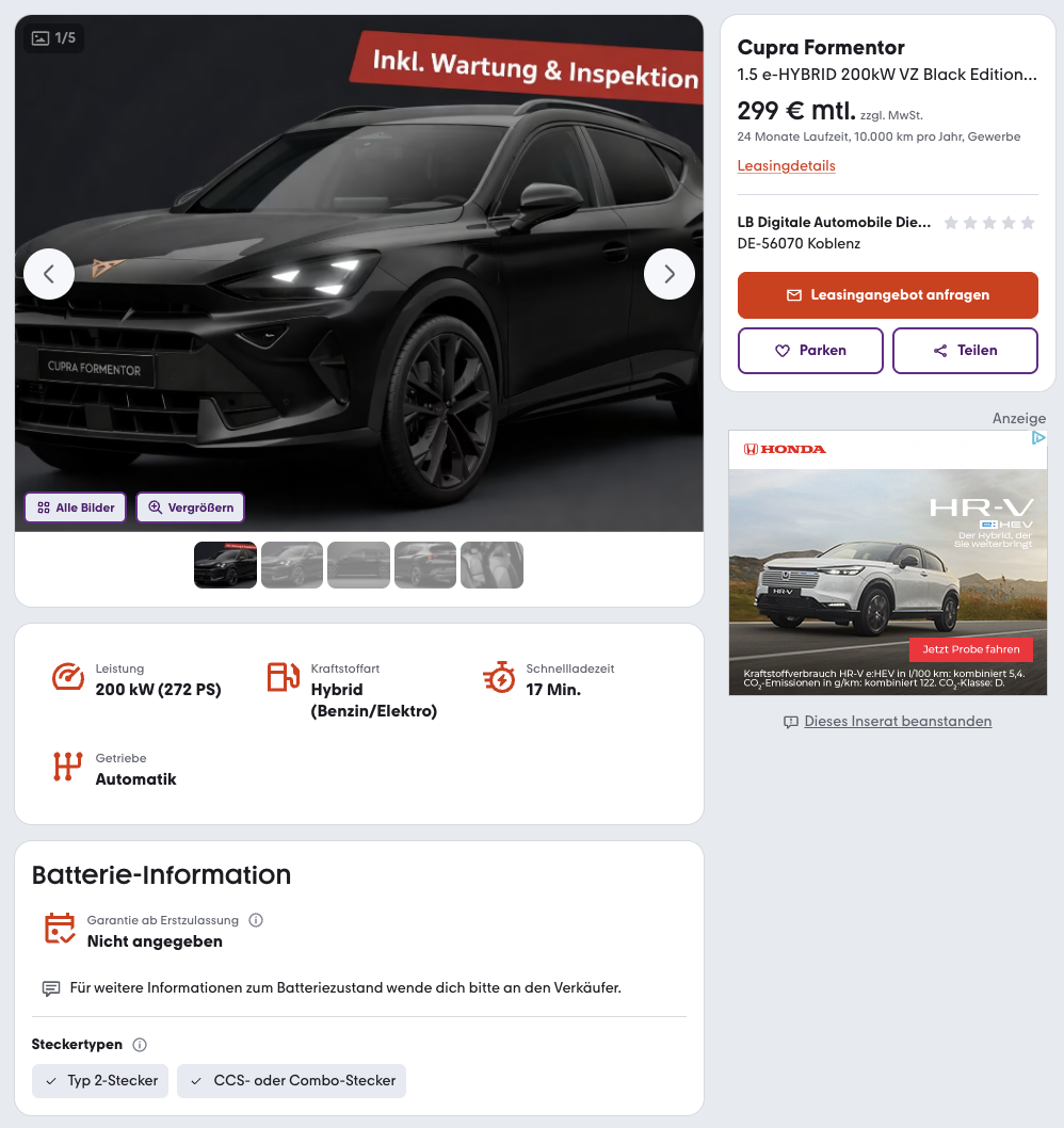 Kalkuliert ist das Angebot auf 24 Monate Laufzeit und 10.000 Kilometer pro Jahr. Besonders deutlich wird die Attraktivität im Marktvergleich. Während der Marktführer für die identische Konfiguration rund 694 Euro netto pro Monat aufruft, liegt dieses Angebot bei 299 Euro netto inklusive Service-Paket. Für Unternehmen, die Cupra-Formentor-Leasing, Plug-in-Hybrid-Dienstwagen oder ein sportliches SUV im Geschäftsleasing suchen, entsteht hier ein Deal mit klarer Signalwirkung, leistungsstark, hochwertig ausgestattet und wirtschaftlich außergewöhnlich attraktiv.