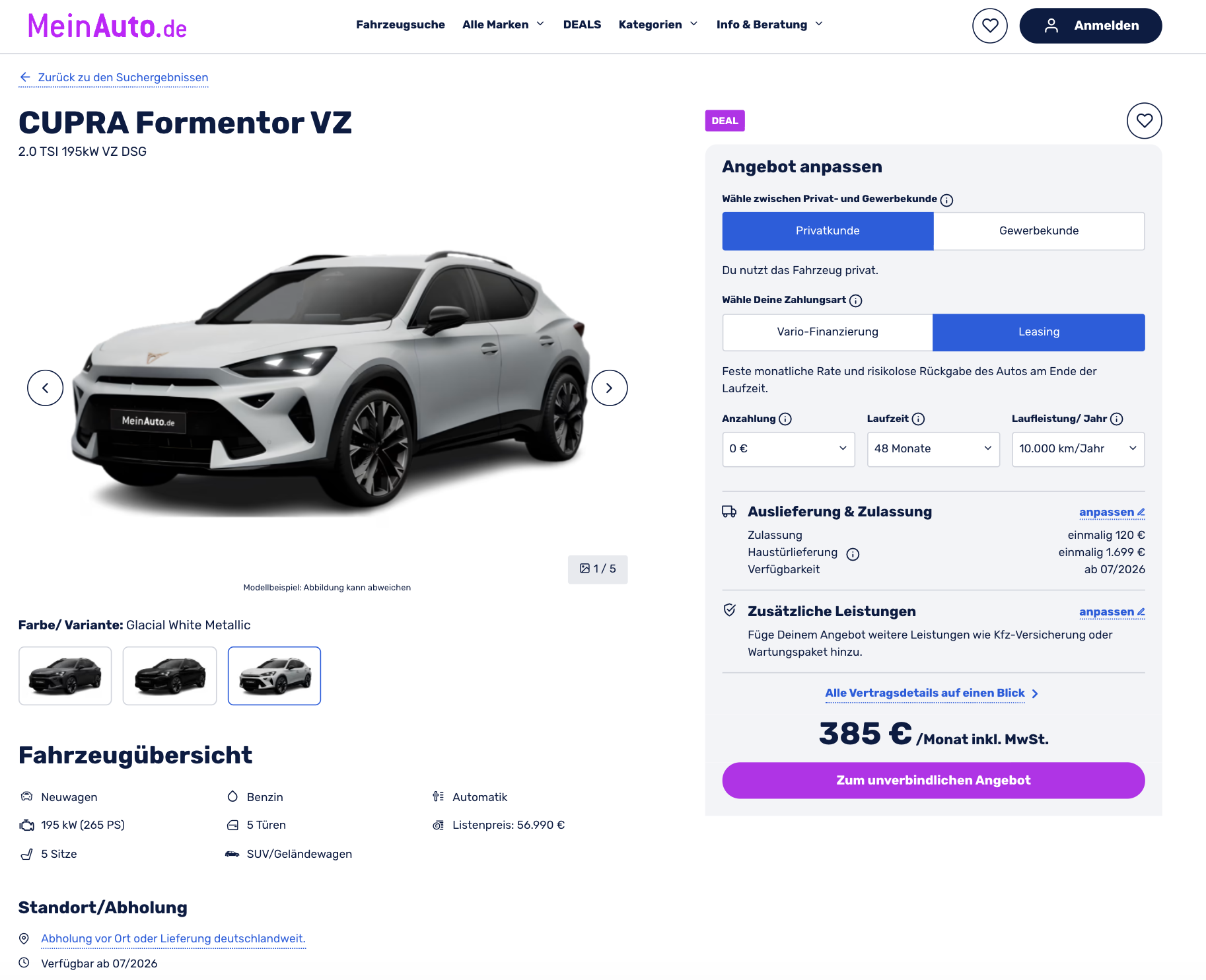 Ein Cupra-SUV auf Sport getrimmt! Den Cupra Formentor VZ 2.0 TSI 195 kW DSG gibt es aktuell bei MeinAuto für 385 Euro brutto im Monat. Das Angebot basiert auf einem bereits bestellten Vorlauffahrzeug, die Auslieferung ist für Juli 2026 vorgesehen. Farblich stehen Glacial White Metallic, Midnight Schwarz Metallic und Magnetic Grau Metallic zur Wahl. Der Formentor VZ kommt mit einer üppigen Sonderausstattung im Wert von 6.100 Euro.