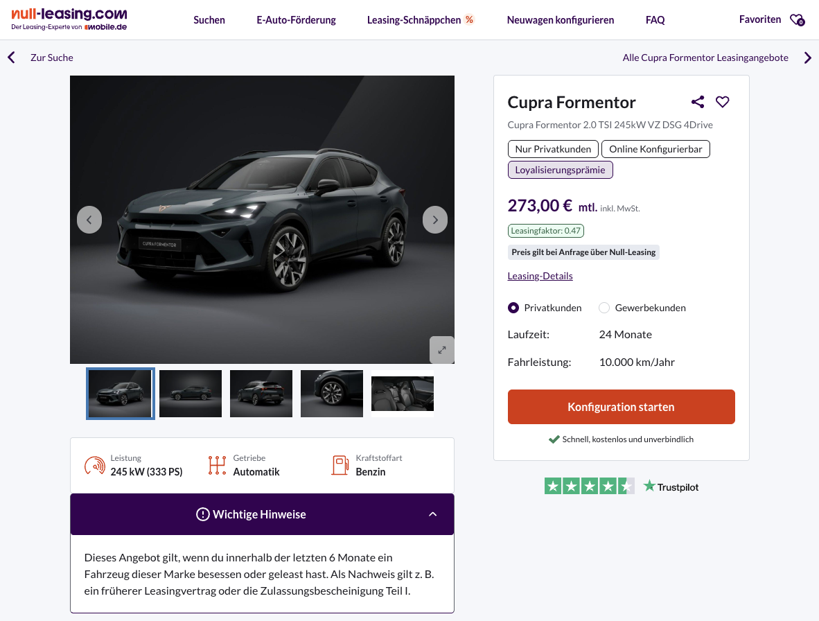 Performance-SUV zum Kompaktpreis! Den Cupra Formentor 2.0 TSI 245 kW VZ DSG 4Drive gibt es bei Null-Leasing für 273 Euro brutto im Monat und richtet sich an Privatkunden mit bestehender Seat- oder Cupra-Historie. Voraussetzung ist ein Fahrzeugbesitz von mindestens sechs Monaten, egal ob geleast, finanziert oder gekauft. Der Deal hat einen starken Leasingfaktor von 0,47. Angeboten wird ein frei konfigurierbares Bestellfahrzeug mit einer Lieferzeit von rund vier Monaten.