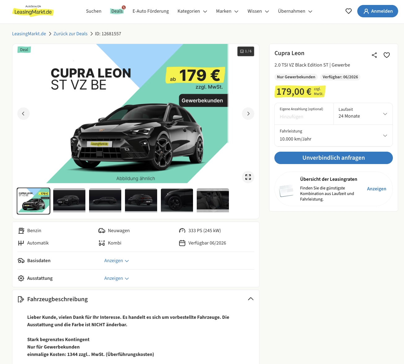 „Was ist das für ein Kombi?“ Diese Frage aus einem bekannten Internet-Meme passt erstaunlich gut zu diesem Cupra-Angebot. Den Cupra Leon ST 2.0 TSI 245 kW 4WD VZ Black Edition könnt ihr bei LeasingMarkt für 179 Euro netto im Monat leasen. Damit wird ein echter Performance-Kombi für Geschäftskunden überraschend günstig kalkuliert. Der Deal überzeugt zusätzlich mit einem Leasingfaktor von nur 0,36 und bietet den Vorteil eines frei konfigurierbaren Bestellfahrzeugs. Farbe, Ausstattung und Details lassen sich also individuell zusammenstellen. Die Lieferzeit liegt bei etwa vier Monaten.