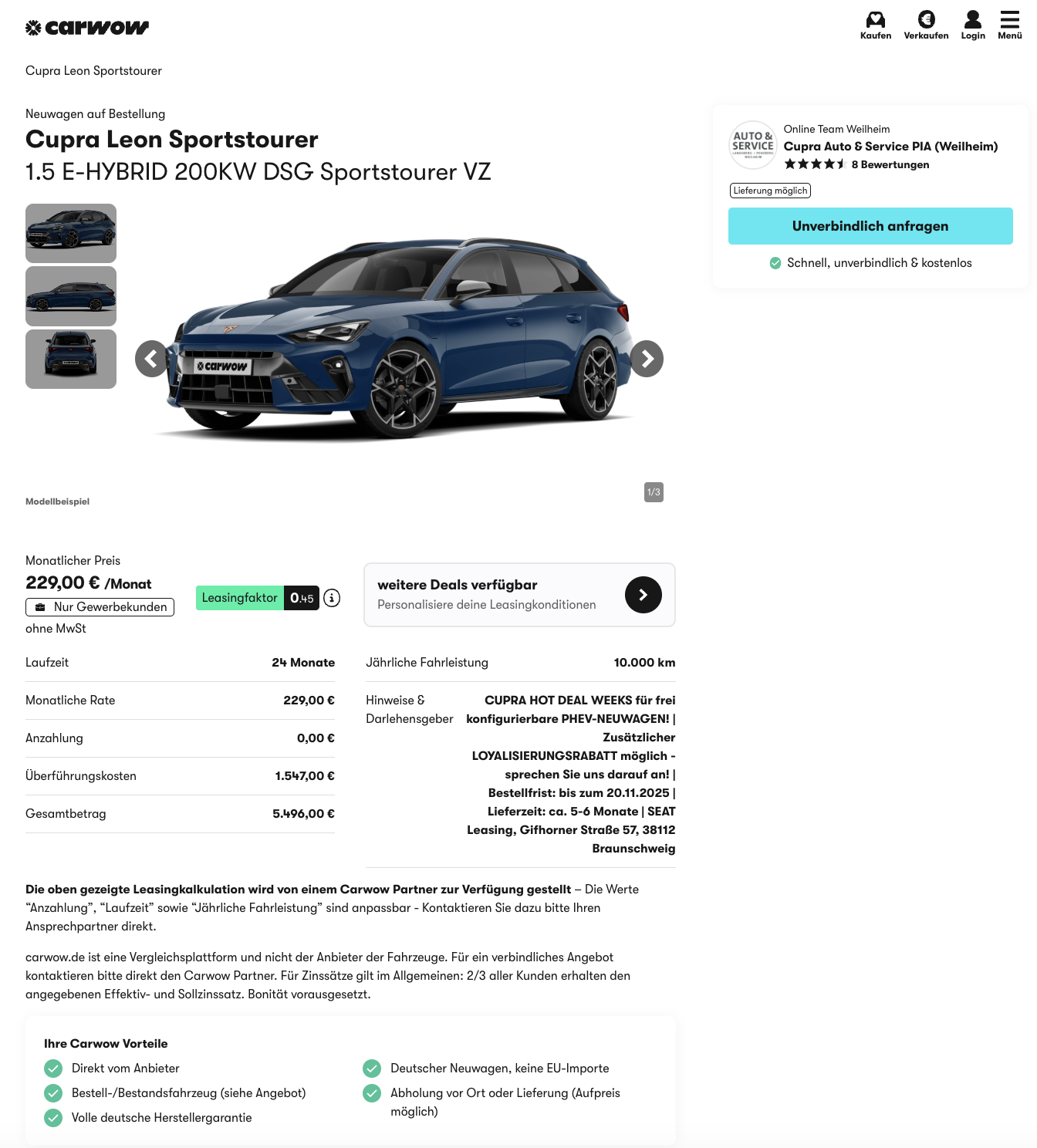 Bei carwow steht der CUPRA Leon Sportstourer 1.5 e-Hybrid DSG VZ für 229 Euro netto pro Monat im Rampenlicht, kalkuliert für 24 Monate und 10.000 km/Jahr. Es ist ein frei konfigurierbares Bestellfahrzeug, ihr wählt Lack, Räder und Ausstattungspakete nach eurem Empfinden. Wichtig für alle, die zeitnah entscheiden möchten, das Angebot läuft nur bis zum 20.11.2025.