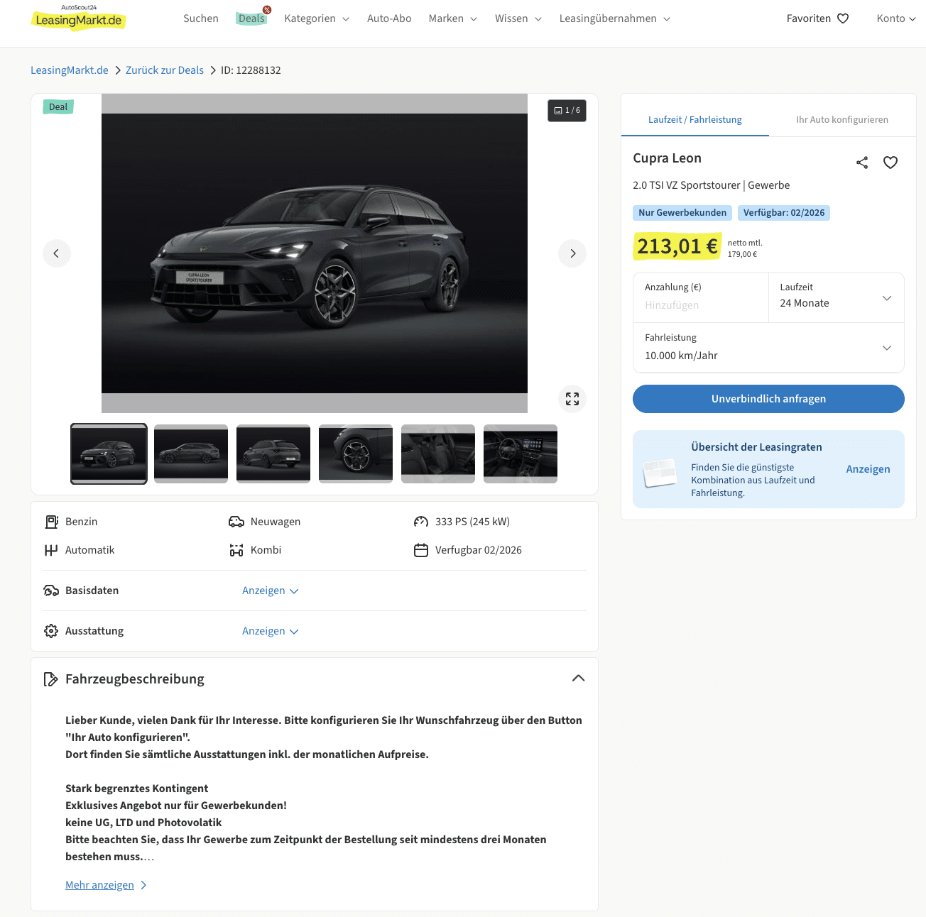 Jetzt heißt es Gas geben, denn bei LeasingMarkt steht aktuell ein echtes Performance-Schnäppchen bereit, der Cupra Leon ST VZ 2.0 TSI 245 kW DSG 4Drive für nur 179 Euro netto im Monat im Geschäftsleasing. Aber Achtung, das Angebot ist stark limitiert. Außerdem handelt es sich um ein frei konfigurierbares Bestellfahrzeug, mit dem ihr ab Februar 2026 rechnen könnt. Ein Vergleich mit dem Platzhirsch zeigt, bei LeasingMarkt spart ihr über 300 Euro, denn der Marktführer verlangt 480 Euro für den Cupra Leon ST VZ.