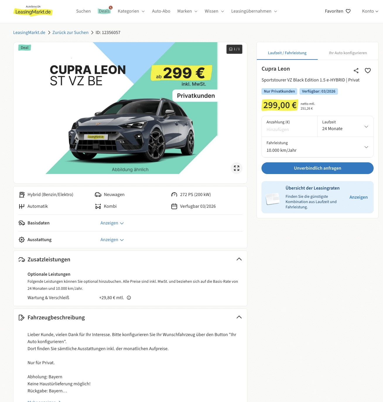 Ein Kombi mit Biss und einem Hang zum effizientem Fahren! LeasingMarkt legt euch den CUPRA Leon Sportstourer 1.5 e-Hybrid DSG VZ Black Edition für 299 Euro brutto pro Monat hin, kalkuliert auf 24 Monate und 10.000 km pro Jahr, Auslieferung ab März 2026. Ein frei konfigurierbares Bestellfahrzeug, ihr bestimmt Lack, Räder, Pakete und Assistenzumfang, die Kosten bleiben sauber lesbar, der Auftritt bleibt kompromisslos sportlich.