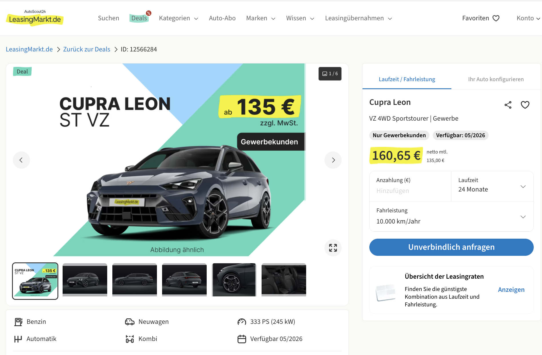 Das Top-Modell könnt ihr bei LeasingMarkt 24 Monate lang und 10.000 km pro Jahr weit fahren, beides lässt sich an euren Bedarf anpassen. Spannend ist, dass der Cupra Leon beim Marktführer aktuell nicht angeboten wird. Dadurch wird dieser Deal für Gewerbekunden noch exklusiver!
