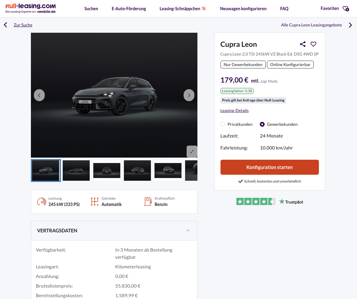 Ein Kombi mit über 300 PS ist normalerweise alles andere als ein Schnäppchen. Genau deshalb fällt dieses Cupra-Angebot besonders auf! Cupra Leon ST 2.0 TSI 245 kW 4WD VZ Black Edition bei Null-Leasing für 179 Euro netto im Monat leasen. Das Angebot richtet sich an Geschäftskunden und basiert auf einem Leasingfaktor von 0,38. Gleichzeitig handelt es sich um ein frei konfigurierbares Bestellfahrzeug, sodass Farbe, Felgen und Ausstattung nach Wunsch zusammengestellt werden können.
