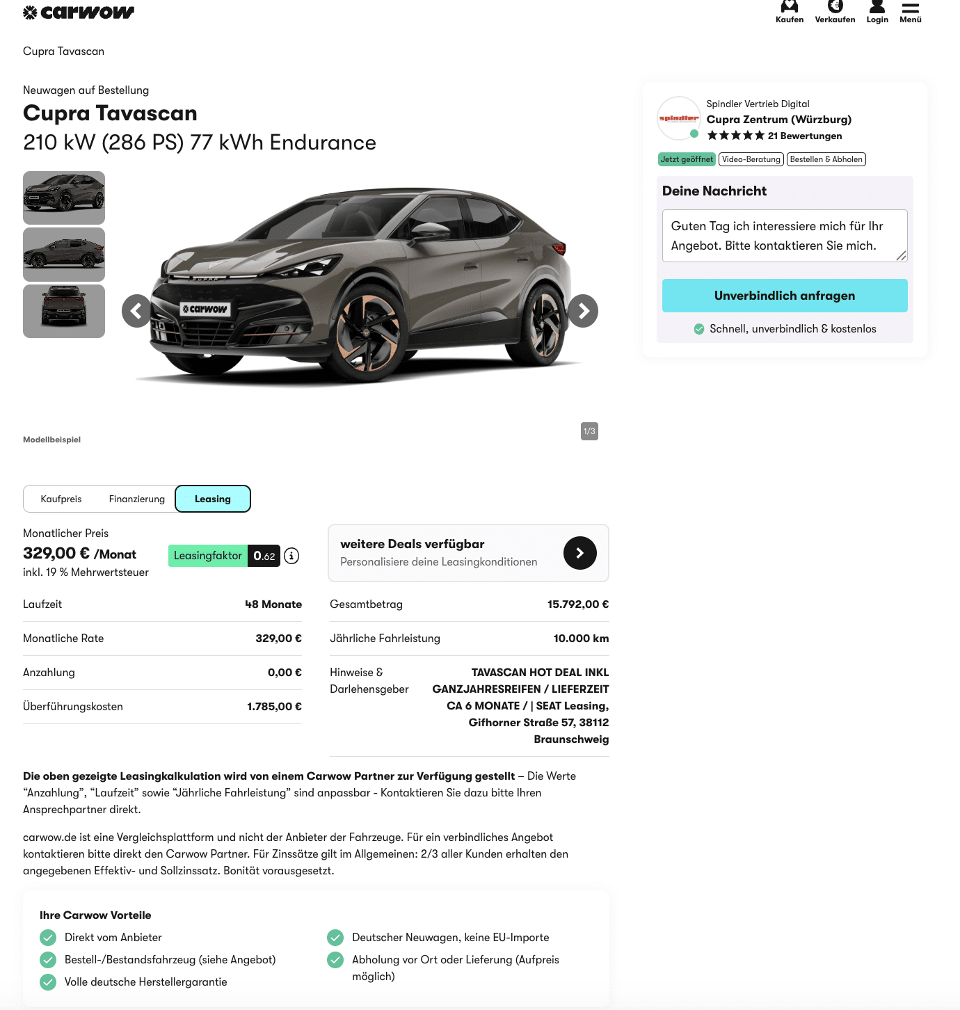 Das Leasingangebot läuft über 48 Monate bei 10.000 Kilometern pro Jahr, kann aber individuell angepasst werden. Und der Preis? Kaum zu schlagen: Während der Marktführer für denselben Tavascan derzeit über 510 Euro brutto monatlich aufruft, spart ihr bei carwow mehr als 150 Euro pro Monat.