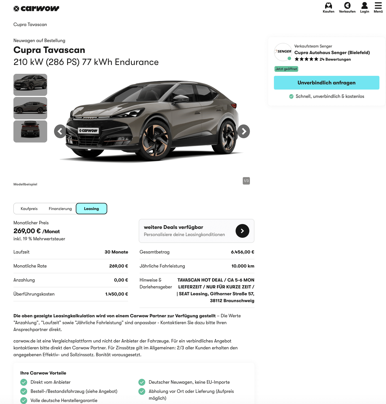 Bei carwow startet der CUPRA Tavascan Endurance 210 kW, 77 kWh im Privatleasing für 269 Euro brutto pro Monat. Es handelt sich um ein frei konfigurierbares Bestellfahrzeug, ihr legt Farbe, Felgen, Pakete und Assistenzen selbst fest, die Lieferkette richtet sich nach euren Prioritäten, nicht nach einem Lagerzettel. Die Lieferzeit liegt bei etwa 5 bis 6 Monaten, was den Einstieg planbar macht und genug Raum lässt, die Wunschkonfiguration sauber zu setzen.