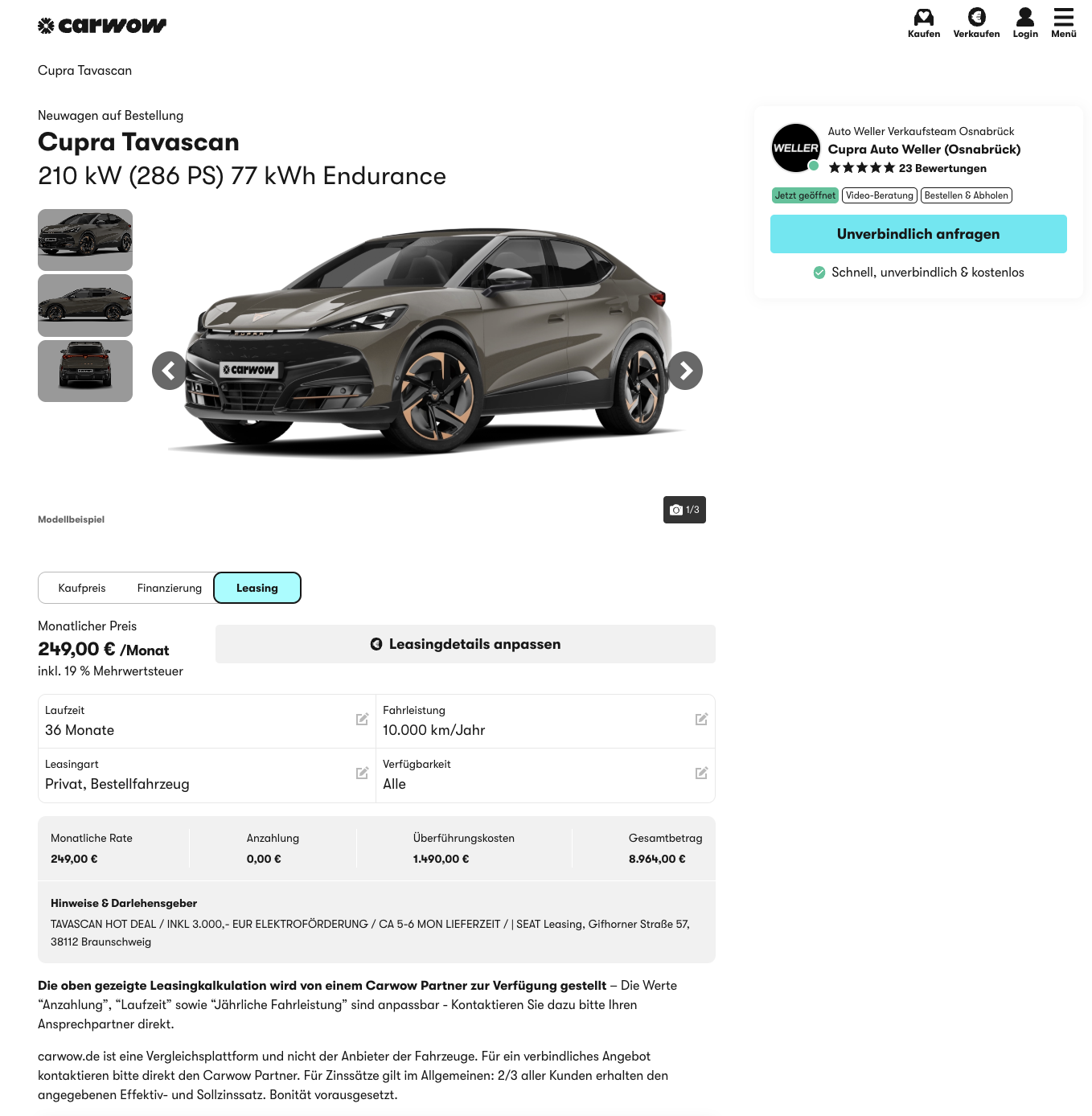 Kalkuliert ist das Angebot auf 36 Monate Laufzeit und 10.000 Kilometer pro Jahr. Und genau hier wird es spannend, denn während im Markt für den CUPRA Tavascan laut Angabe über 424 Euro brutto im Monat aufgerufen werden, liegt dieses Angebot mit 249 Euro brutto deutlich darunter.