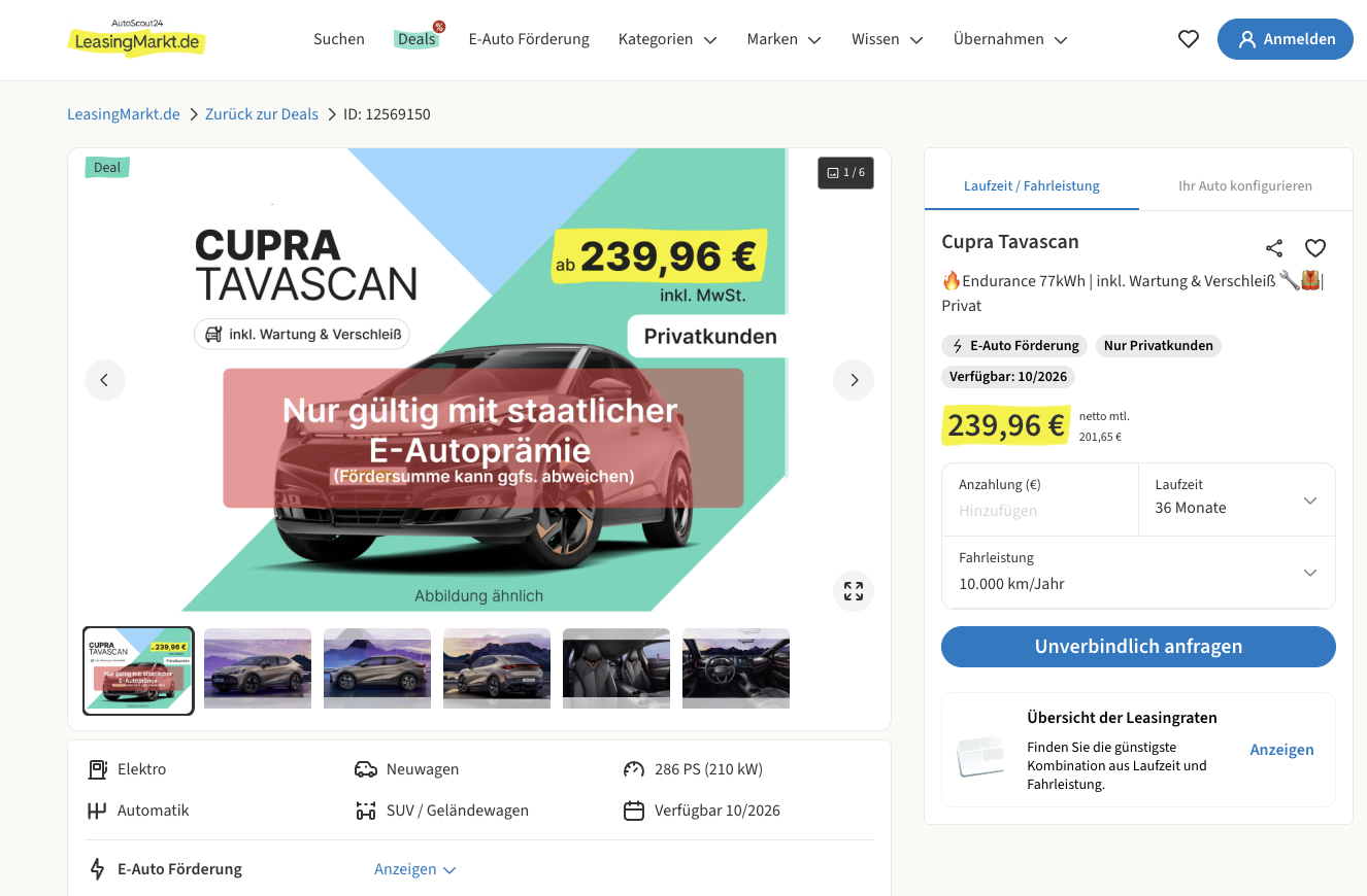 Der Cupra Tavascan bringt genau das auf die Straße, was viele aktuell suchen, ein sportlich gezeichnetes Elektro-SUV mit kräftigem Heckantrieb, großer Batterie und einem Leasingpreis, der im Markt auffällt. Bei LeasingMarkt gibt es den Cupra Tavascan aktuell für 239,96 Euro brutto pro Monat, kalkuliert mit 3.000 Euro Umweltprämie als Sonderzahlung, inklusive Wartung & Verschleiß. Es handelt sich um ein frei konfigurierbares Bestellfahrzeug, die Auslieferung ist für Oktober 2026 vorgesehen.
