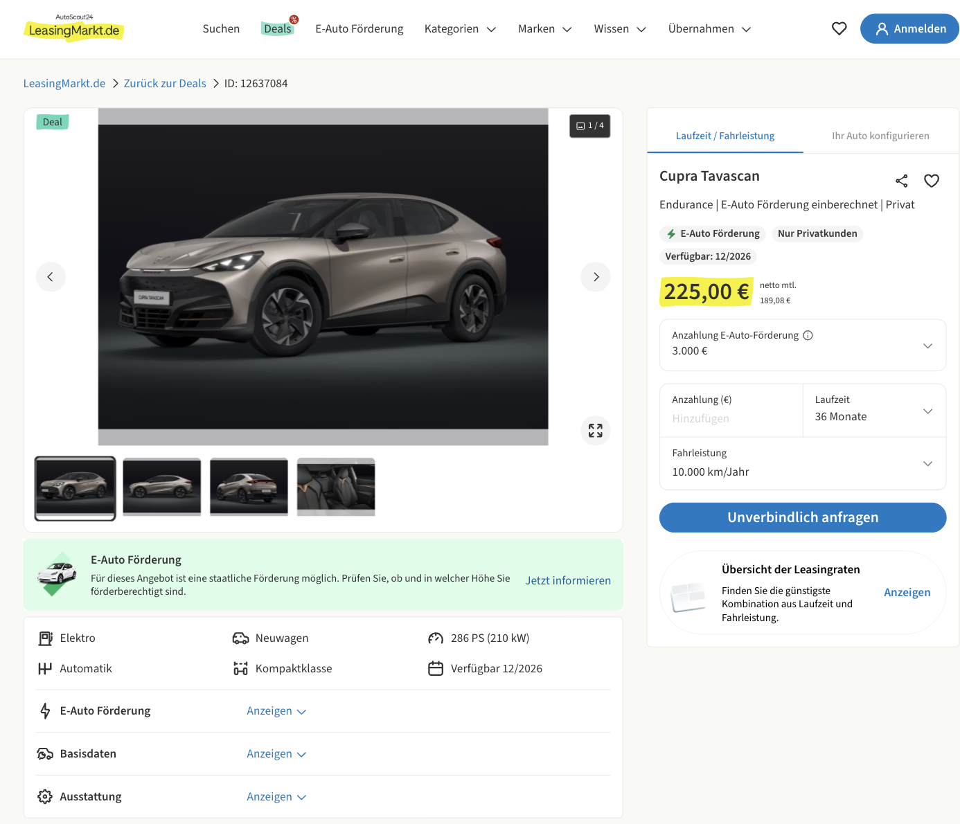 Der Cupra Tavascan ist kein braves Elektro-SUV, sondern ein bewusst sportlich gezeichnetes SUV-Coupé mit Heckantrieb und klarer Performance Haltung. Cupra Tavascan 210 kW 77 kWh Endurance bei LeasingMarkt für 225 Euro brutto im Monat ist das Privatleasing Angebot, die E-Förderung in Höhe von 3.000 Euro ist bereits berücksichtigt und als Sonderzahlung eingerechnet. Als frei konfigurierbares Bestellfahrzeug lässt sich der Tavascan nach euren Anforderungen zusammenstellen, von der Außenfarbe bis zu den Paketen. Die Auslieferung ist für Dezember 2026 geplant, dadurch ist das Angebot vor allem für alle spannend, die schon jetzt für das kommende Jahr planen und dabei eine klare Monatsrate im Blick behalten wollen.