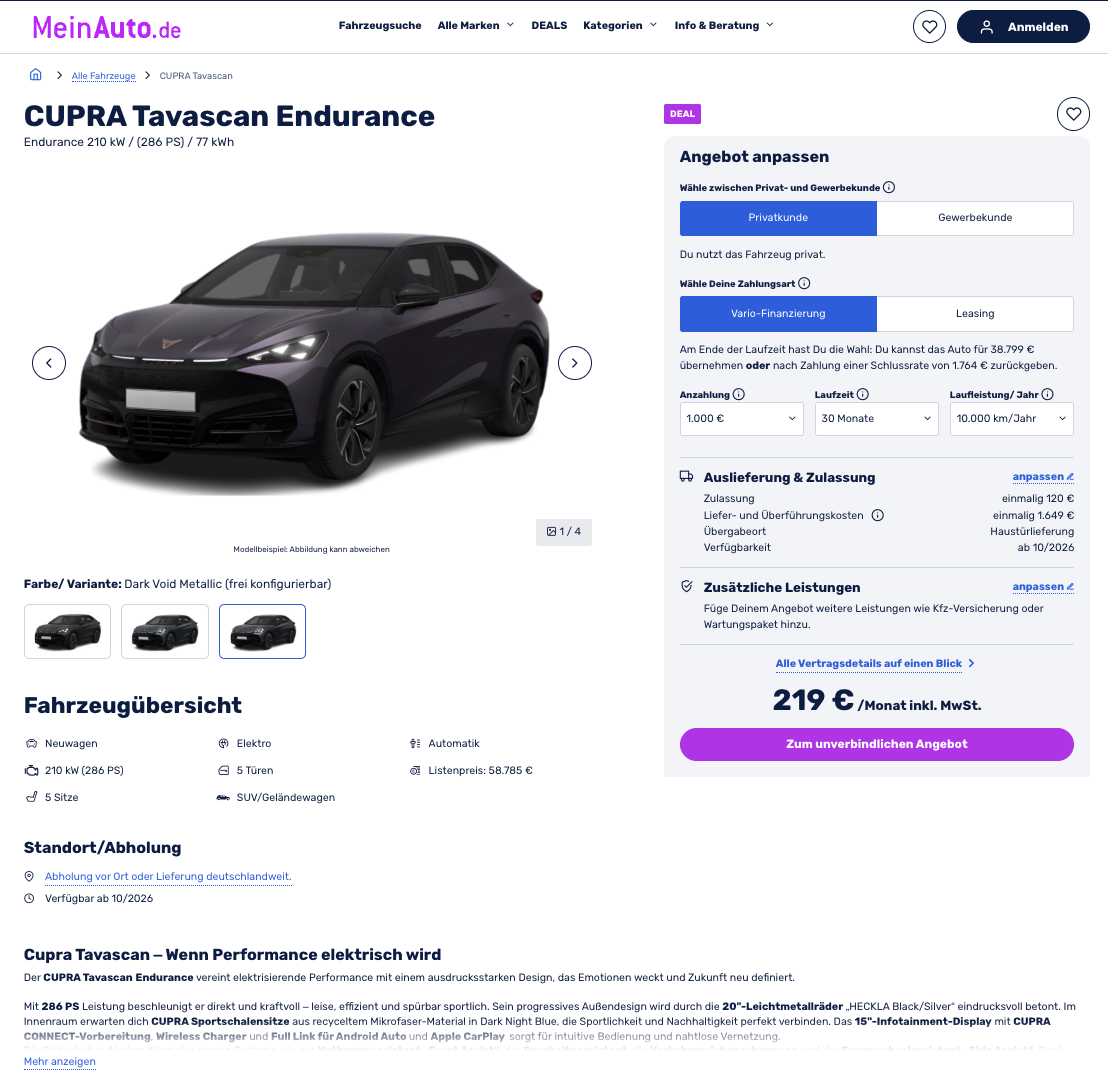 Kalkuliert ist das Angebot auf 30 Monate Laufzeit und 10.000 Kilometer pro Jahr, Anpassungen sind möglich. Besonders stark wird der Deal im Vergleich. Während der Marktführer für ein vergleichbares elektrisches SUV rund 358 Euro brutto pro Monat aufruft, bei gleicher Anzahlung, liegt dieses Angebot deutlich darunter. Für alle, die gezielt nach Cupra Tavascan Leasing, elektrischem SUV-Coupé im Leasing oder einem sportlichen E-Auto mit hoher Reichweite suchen, entsteht hier ein Angebot, das Emotion, Leistung und Preis ungewöhnlich sauber zusammenbringt.