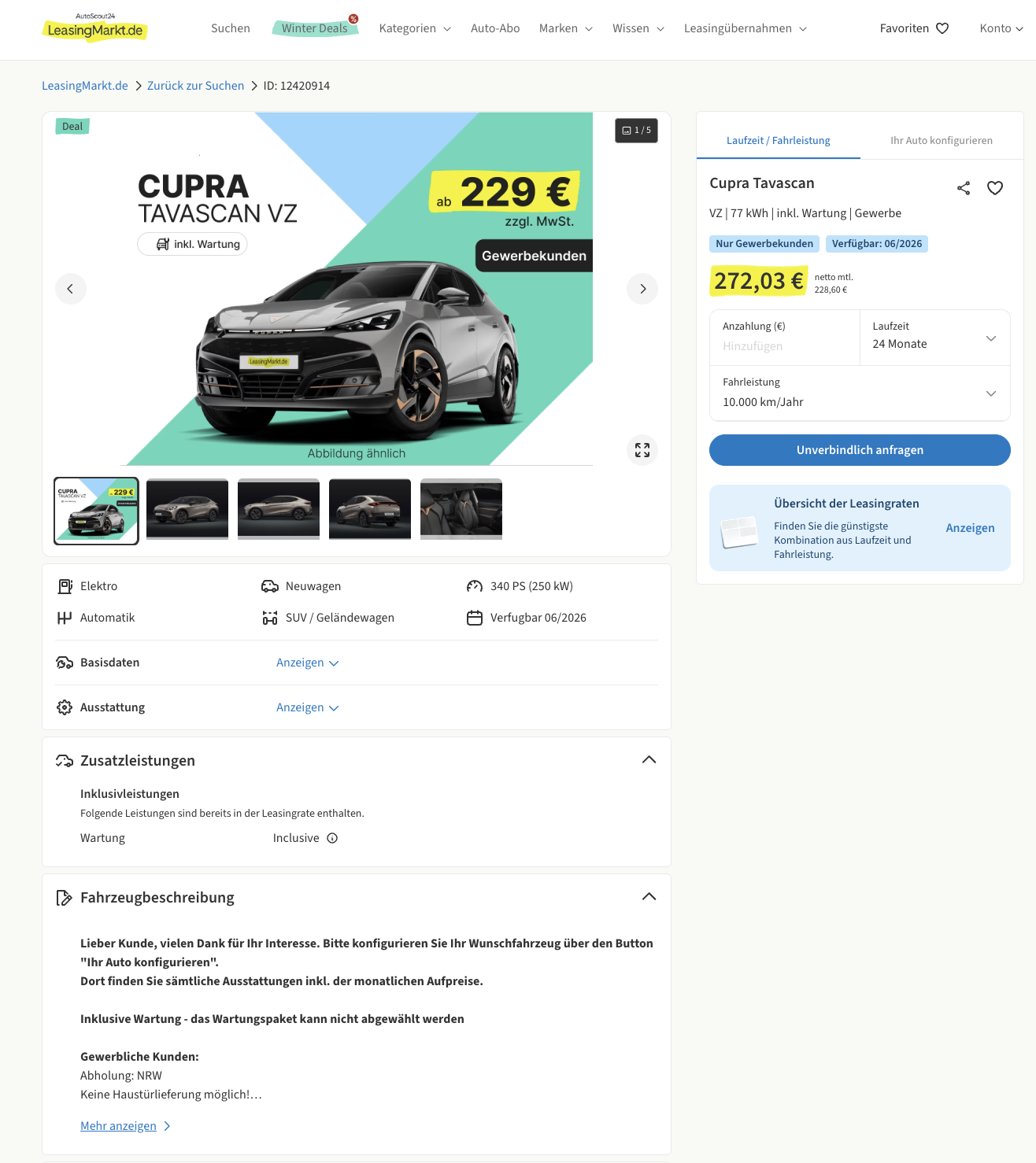 Die Kalkulation bei LeasingMarkt läuft über 24 Monate Laufzeit und 10.000 Kilometer pro Jahr, andere Profile sind möglich und lassen sich an euer Fahrverhalten anpassen. Im Vergleich dazu liegt der Marktführer mit einem ähnlich konfigurierten Cupra Tavascan bei etwa 405 Euro netto im Monat, hier stehen 228,60 Euro netto inklusive Wartung in der Tabelle. Dadurch wird der Cupra Tavascan VZ 4Drive zu einem Angebot, das sportlichen Anspruch, vollelektrischen Antrieb, Allrad und ein deutlich freundlicheres Kostenblatt miteinander verbindet.