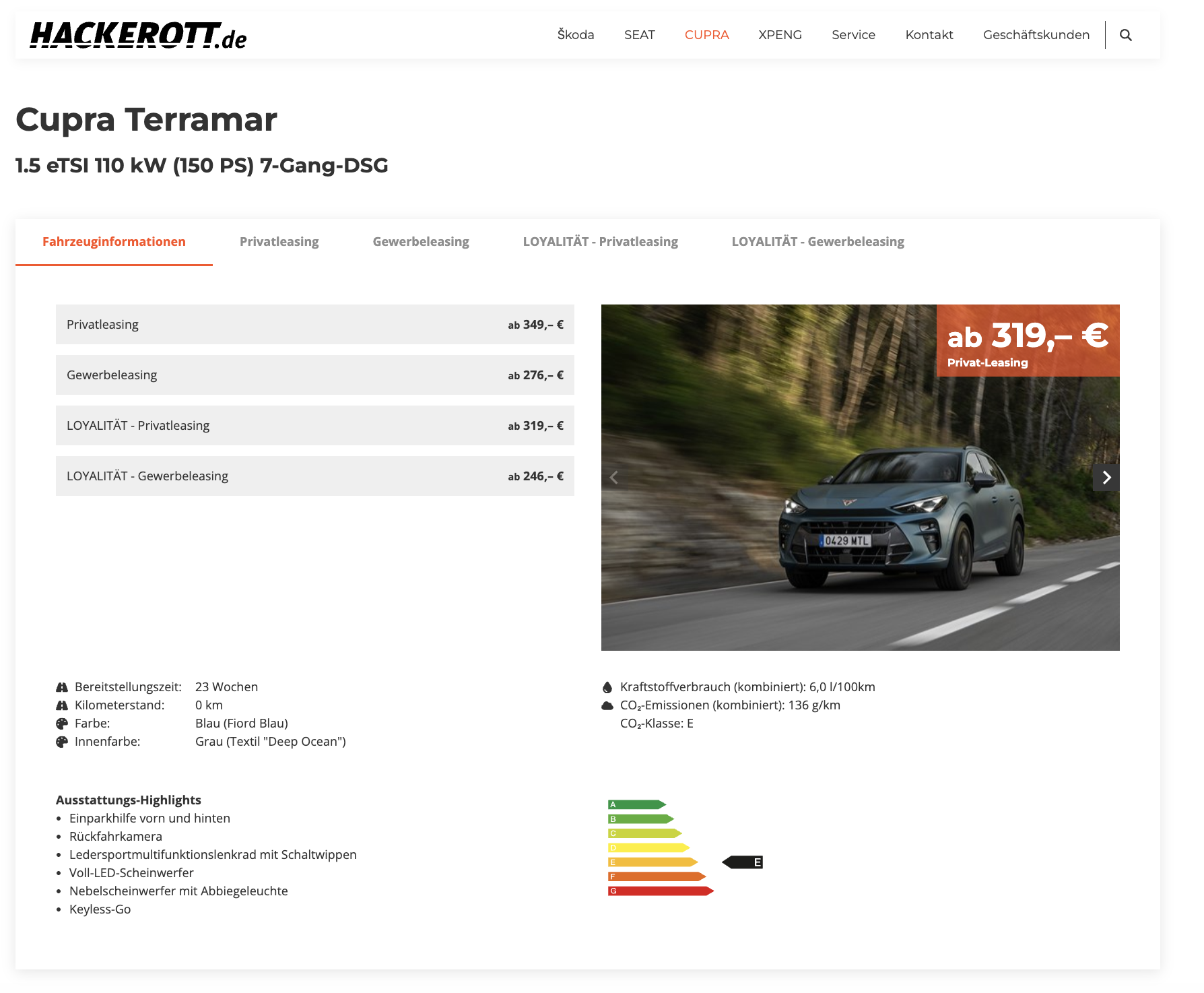 Die Konditionen sind auf 48 Monate Laufzeit und 10.000 Kilometer pro Jahr ausgelegt, Anpassungen sind in der Regel möglich. Entscheidend bleibt der Blick in den Markt, der Platzhirsch ruft für den Terramar aktuell rund 393 Euro brutto im Monat auf. Mit 319 Euro brutto im Privatleasing für Loyalitätskunden und 246 Euro netto für Geschäftskunden setzt Hackerott eine klare Marke. Wer bereits Seat oder Cupra fährt und nun in die neue Cupra SUV Liga aufsteigen möchte, bekommt mit dem Terramar 1.5 eTSI DSG ein Paket, das Design, Technik und Preisvorteil sehr sauber zusammenführt.