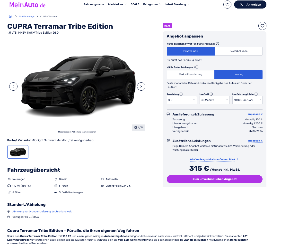 Kalkuliert ist das Angebot auf 48 Monate Laufzeit und 10.000 Kilometer pro Jahr, beide Werte lassen sich anpassen. Besonders interessant wird der Deal im Marktvergleich, denn der Cupra Terramar ist beim Marktführer aktuell nicht bestellbar.