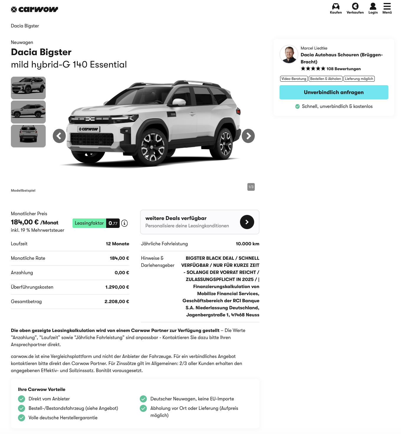 Das Angebot ist bewusst kompakt gehalten, mit 12 Monaten Laufzeit und 10.000 Freikilometer, auf Wunsch anpassbar. Der Blick über den Tellerrand bestätigt den Preisvorteil, beim Marktführer steht der Bigster derzeit bei 309 Euro brutto im Monat. Gegenüber 184 Euro bei carwow spart ihr über die Laufzeit rund 1.500 Euro, ein Wert, der auf dem Konto sichtbar bleibt und die Entscheidung leicht macht.