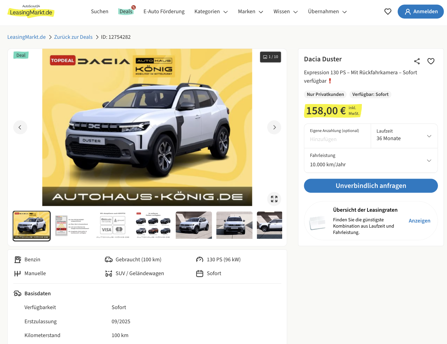 Der Dacia Duster steht seit Jahren für ein klares Versprechen, viel Auto für überschaubares Geld. Genau dieses Prinzip wird mit diesem Angebot konsequent fortgeführt. Schnappt euch den Dacia Duster 1.2 TCe 130 Expression bei LeasingMarkt für 159 Euro brutto im Monat, ein Fahrzeug für alle, die ein unkompliziertes SUV suchen aber ohne sich finanziell zu weit aus dem Fenster zu lehnen. Besonders interessant, es handelt sich um eine Tageszulassung mit Erstzulassung im September 2025 und einem Kilometerstand von rund 100 Kilometern. Damit ist das Fahrzeug faktisch neuwertig, ohne die typische Wartezeit eines klassischen Bestellwagens. Die Bereitstellung erfolgt innerhalb von sechs bis acht Wochen.