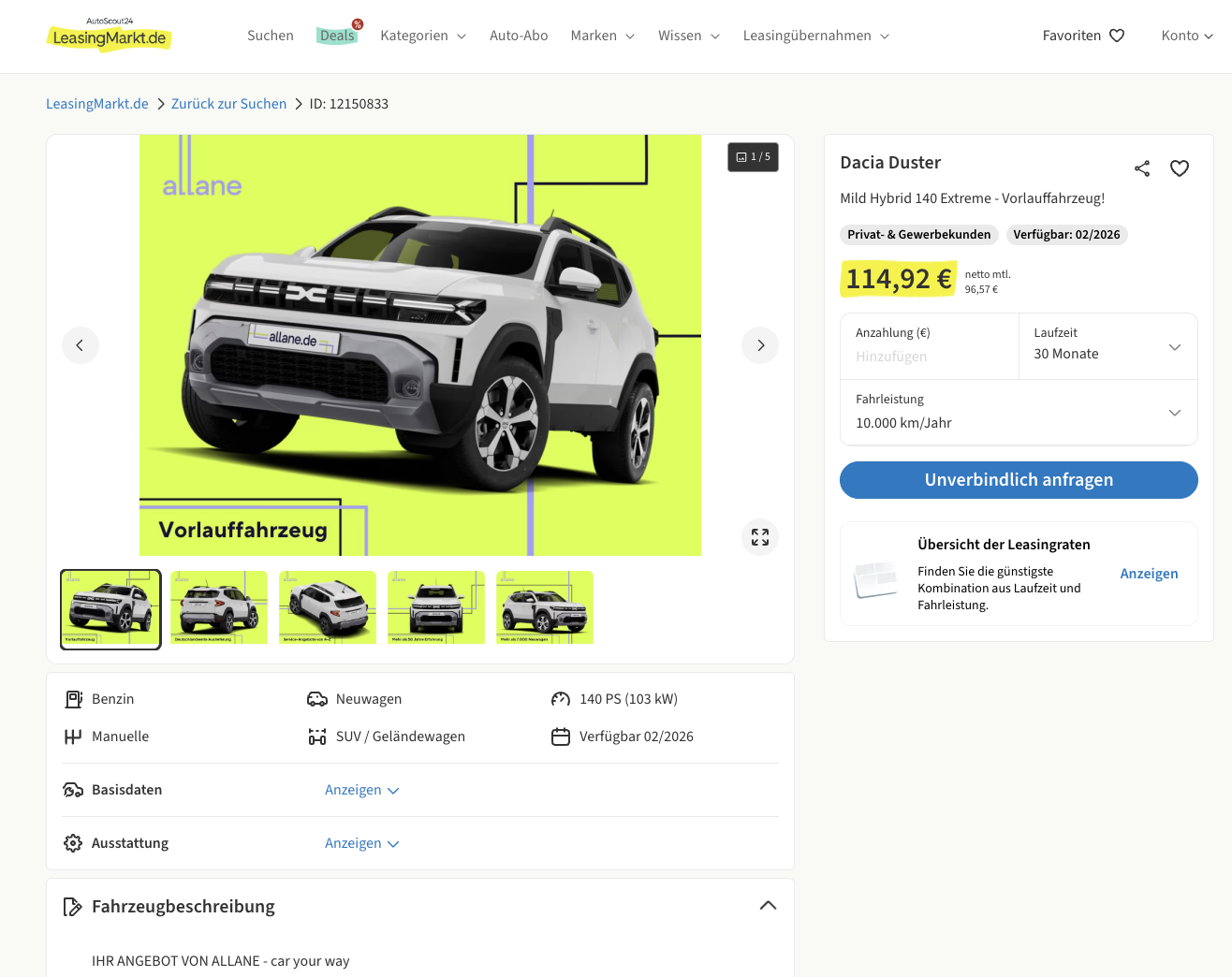 Das Angebot ist auf 30 Monate Laufzeit und 10.000 Kilometer pro Jahr kalkuliert, Anpassungen sind problemlos möglich. Besonders spannend ist, dass diese Motorisierung aktuell beim Marktführer nicht verfügbar ist, was den Deal zusätzlich aufwertet. Mit der niedrigen Monatsrate, der flexiblen Kauf- oder Rückgabeoption und der soliden Ausstattung entsteht ein Leasingangebot, das den Dacia Duster Mild Hybrid 140 Extreme als wirtschaftlich sinnvolles SUV-Leasing positioniert, mit mehr Substanz, als viele auf den ersten Blick erwarten würden.