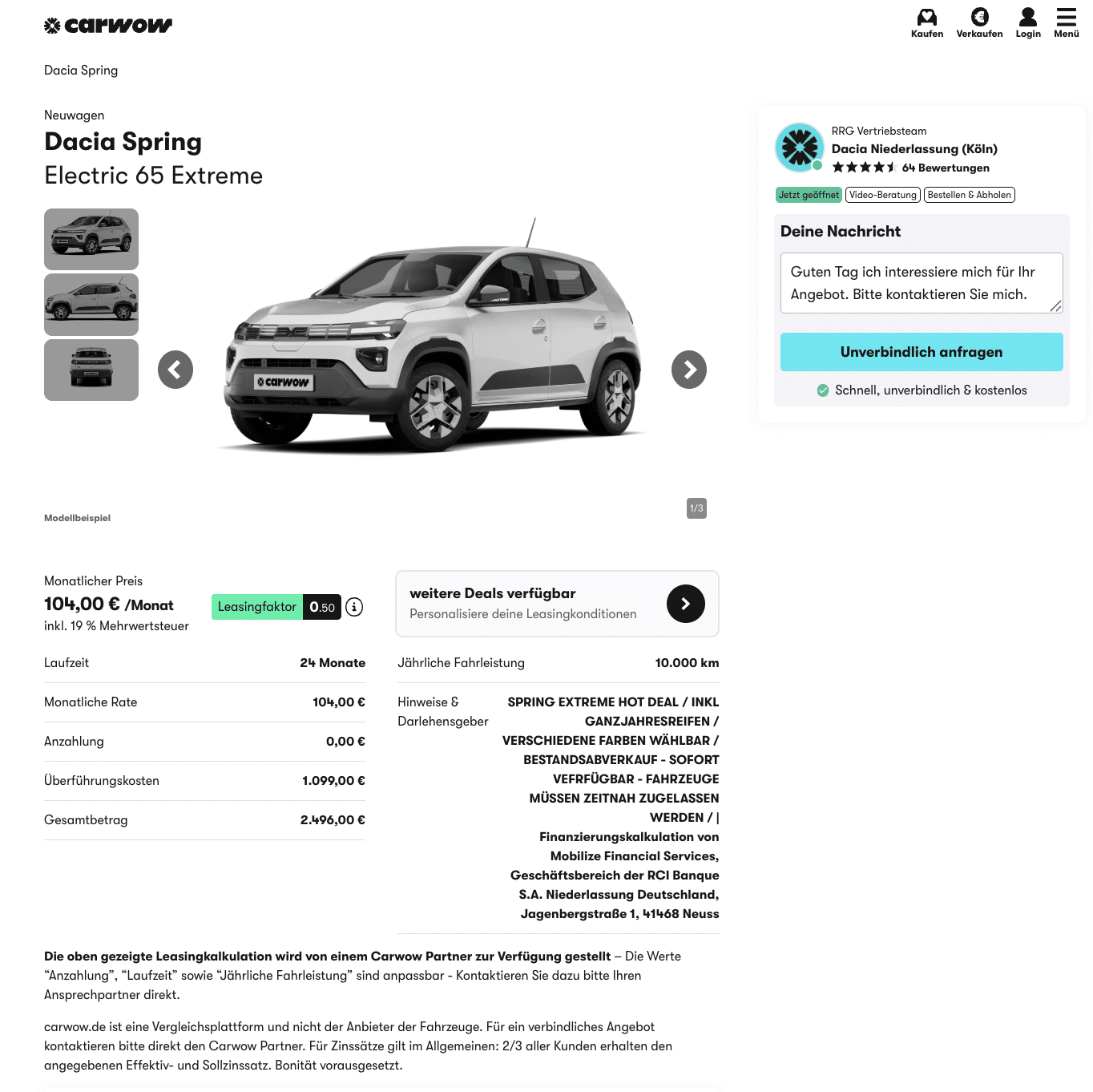 Zum Vergleich: Der Marktführer verlangt für denselben Dacia Spring Extreme aktuell rund 233 Euro brutto im Monat, also mehr als das Doppelte.