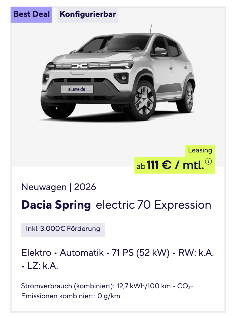 Elektroauto zum Einstiegspreis, flexibel bleiben mit dem Dacia Spring. Bei Allane gibt es den Dacia Spring Electric 70 Expression im Vario-Leasing für 111 Euro brutto pro Monat. Das Angebot basiert auf 3.000 Euro Anzahlung, 36 Monaten Laufzeit und 10.000 Kilometern pro Jahr. Gleichzeitig bleibt das Fahrzeug als frei konfigurierbares Bestellmodell individuell anpassbar.
