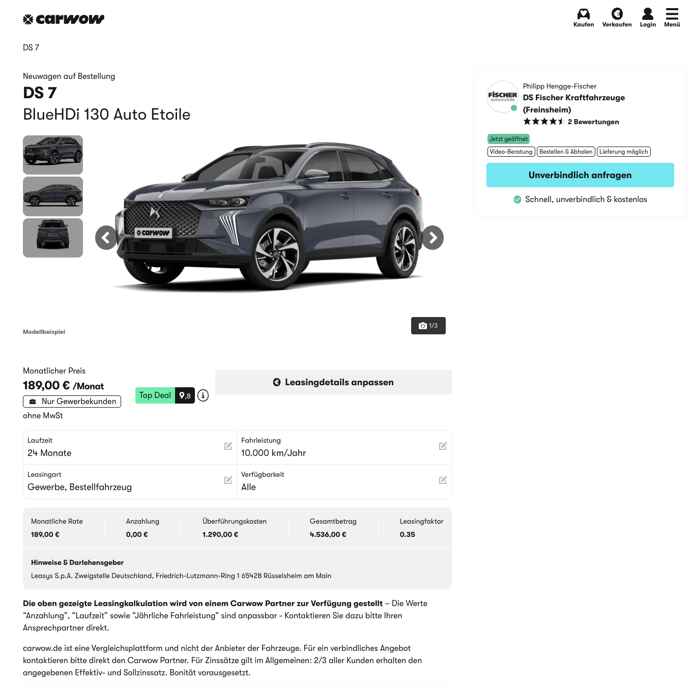 Kalkuliert ist das Angebot mit 24 Monaten Laufzeit und 10.000 Kilometern pro Jahr, Anpassungen sind in der Regel möglich. Der Marktvergleich fällt klar aus, denn während der Platzhirsch den DS 7 BlueHDi 130 aktuell mit rund 283 Euro netto pro Monat anbietet, liegt dieses Angebot deutlich darunter.