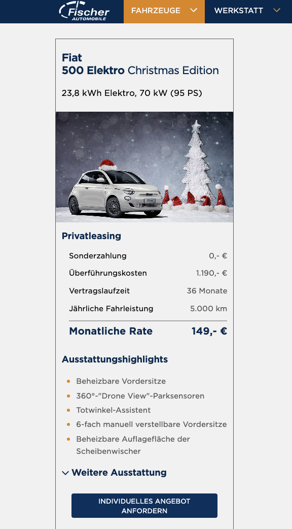 🎄 Weihnachtsstimmung auf Italienisch, nur ohne Lametta. Fiat 500e 23,8 kWh Christmas Edition bei Fischer Automobile für 149 Euro im Monat brutto im Privatleasing, als Bestellaktion, die ihr nach euren Wünschen konfigurieren könnt. Farbe, Felgen, Details, ihr würzt euch euren Stromer selbst, die Christmas Edition bringt von Haus aus schon viel Ausstattung mit.