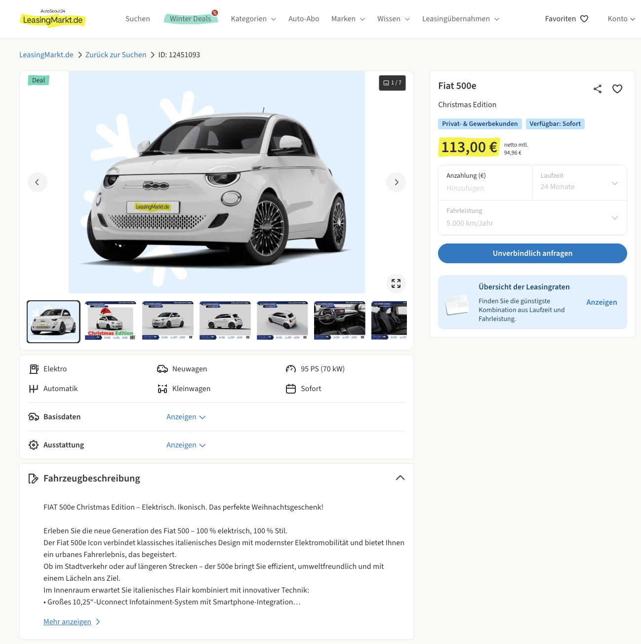 Die Kalkulation bei LeasingMarkt basiert auf 24 Monaten Laufzeit und 5.000 Kilometern pro Jahr, beides lässt sich anpassen, wenn der Alltag mehr Strecke verlangt. Richtig interessant wird der Blick auf den Vergleich, denn die Christmas Edition des Fiat 500e liegt beim Platzhirsch aktuell bei rund 583 Euro brutto im Monat. Das Angebot für 113 Euro brutto stellt dem kleinen Elektro Fiat damit ein Preis Schild zur Seite, das den festlich ausgestatteten Citystromer zu einem der spannendsten Lifestyle Deals im elektrischen Kleinstwagen Segment macht.