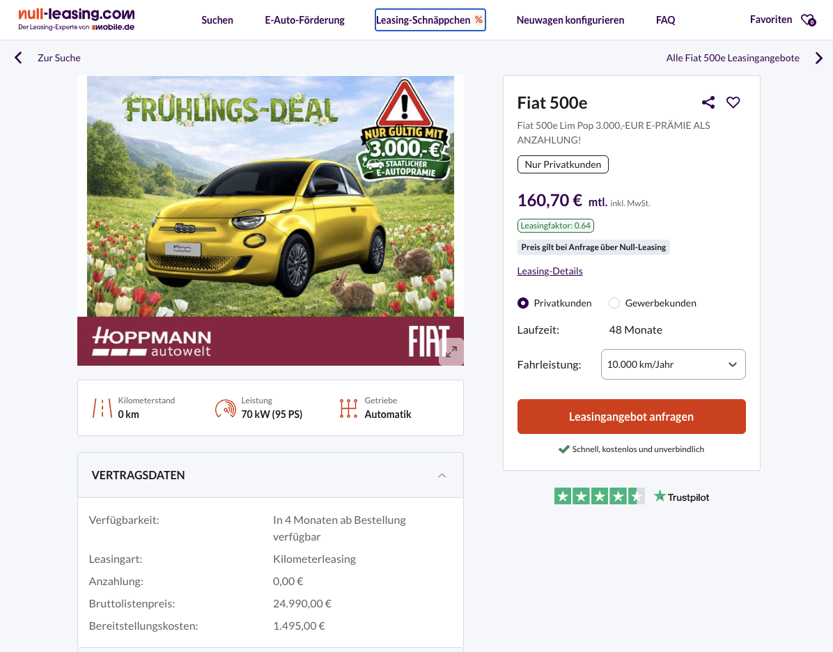 Der Fiat 500e steht wie kaum ein anderes Modell für kompaktes Design und elektrische Alltagstauglichkeit. Bei Null-Leasing könnt ihr den Fiat 500e 23,8 kWh Pop aktuell für 160,70 Euro brutto im Monat leasen, bei einer Sonderzahlung von 3.000 Euro, die im Rahmen der aktuellen Umweltprämie angesetzt ist. Entscheidend für eine saubere Bewertung bleibt jedoch die umgerechnete Monatsrate. 223,20 Euro brutto pro Monat ergeben sich, wenn die Prämie realistisch auf die Laufzeit verteilt wird, unabhängig davon, ob sie vollständig erstattet wird. Angeboten wird ein frei konfigurierbares Bestellfahrzeug mit etwa vier Monaten Lieferzeit.
