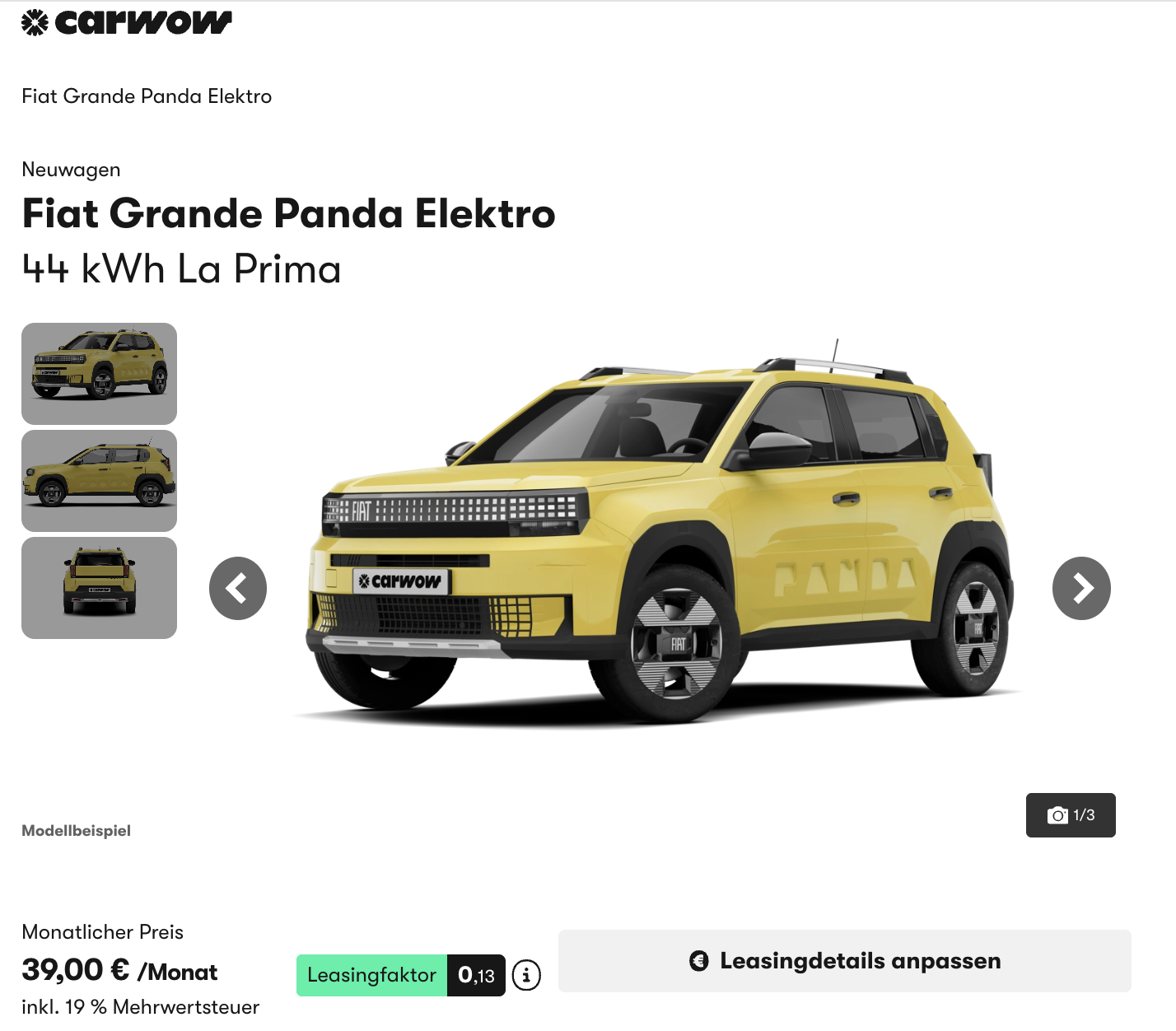 Italienischer Elektro-Lifestyle, gĂŒnstiger als ein Handyvertrag? Der Fiat Grande Panda 44 kWh La Prima ist bei Carwow fĂŒr nur 39 Euro brutto im Monat zu haben, kalkuliert auf 36 Monate Laufzeit und 5.000 Kilometer pro Jahr. Das Fahrzeug ist bereits bestellt und hat eine Lieferzeit von 1-2 Monaten. Wer die volle UmweltprĂ€mie beziehen kann, findet einen unglaublichen Leasingfaktor von 0,13 vor!