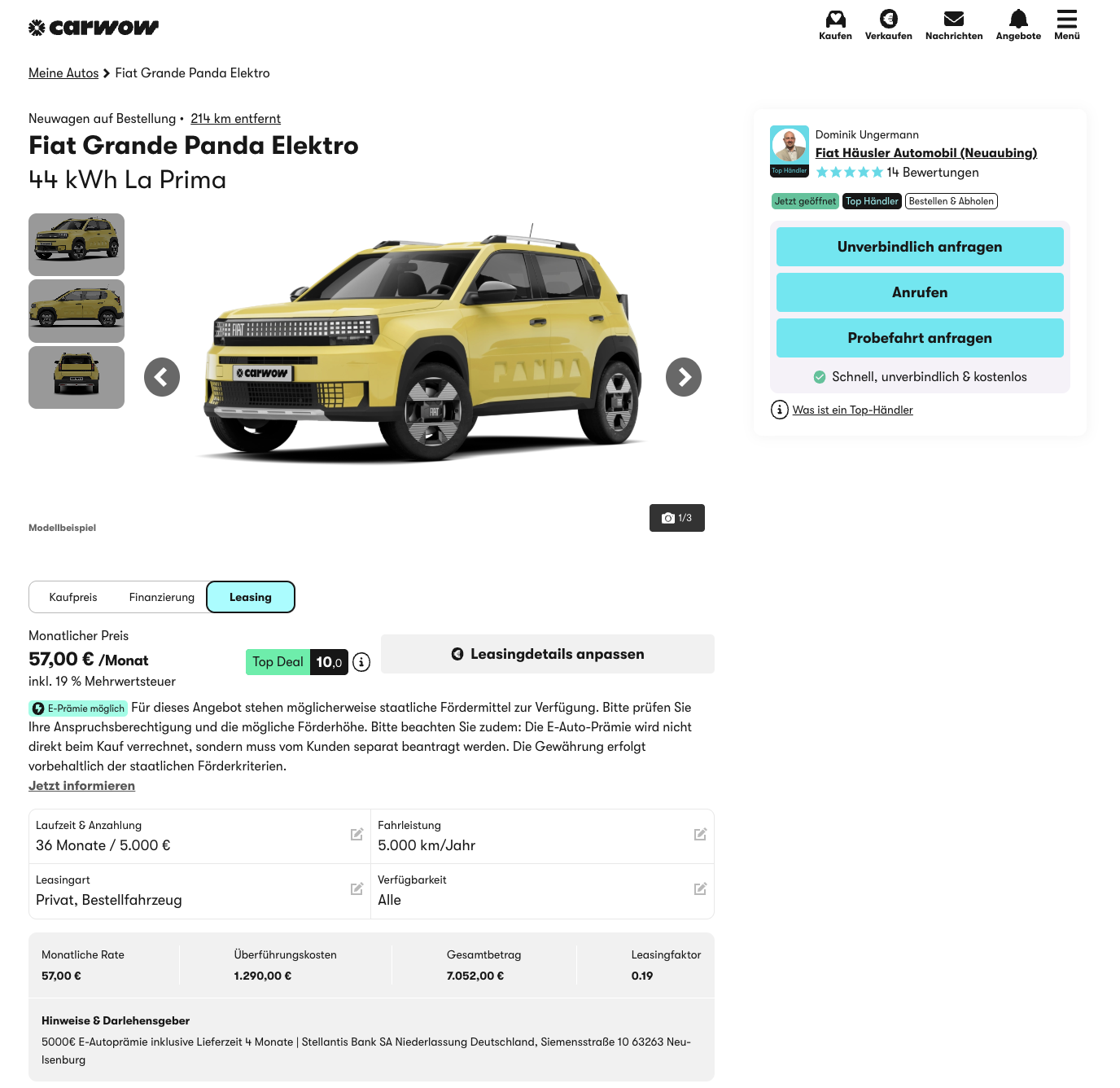 Der Fiat Grande Panda bringt frischen Wind in die elektrische Kleinwagenklasse und verbindet Retro-Charme mit moderner Technik. Fiat Grande Panda 44 kWh La Prima bei carwow für 57 Euro brutto im Monat macht genau dieses Konzept auf den ersten Blick extrem günstig zugänglich. Möglich wird die Rate durch eine Anzahlung von 5.000 Euro, die im Rahmen der Umweltprämie teilweise oder vollständig erstattet werden kann. Rechnet man die Sonderzahlung sauber auf die Laufzeit um, ergibt sich eine realistische Leasingrate von 195,89 Euro brutto im Monat. Das Fahrzeug ist frei konfigurierbar und wird aktuell mit rund vier Monaten Lieferzeit angegeben.