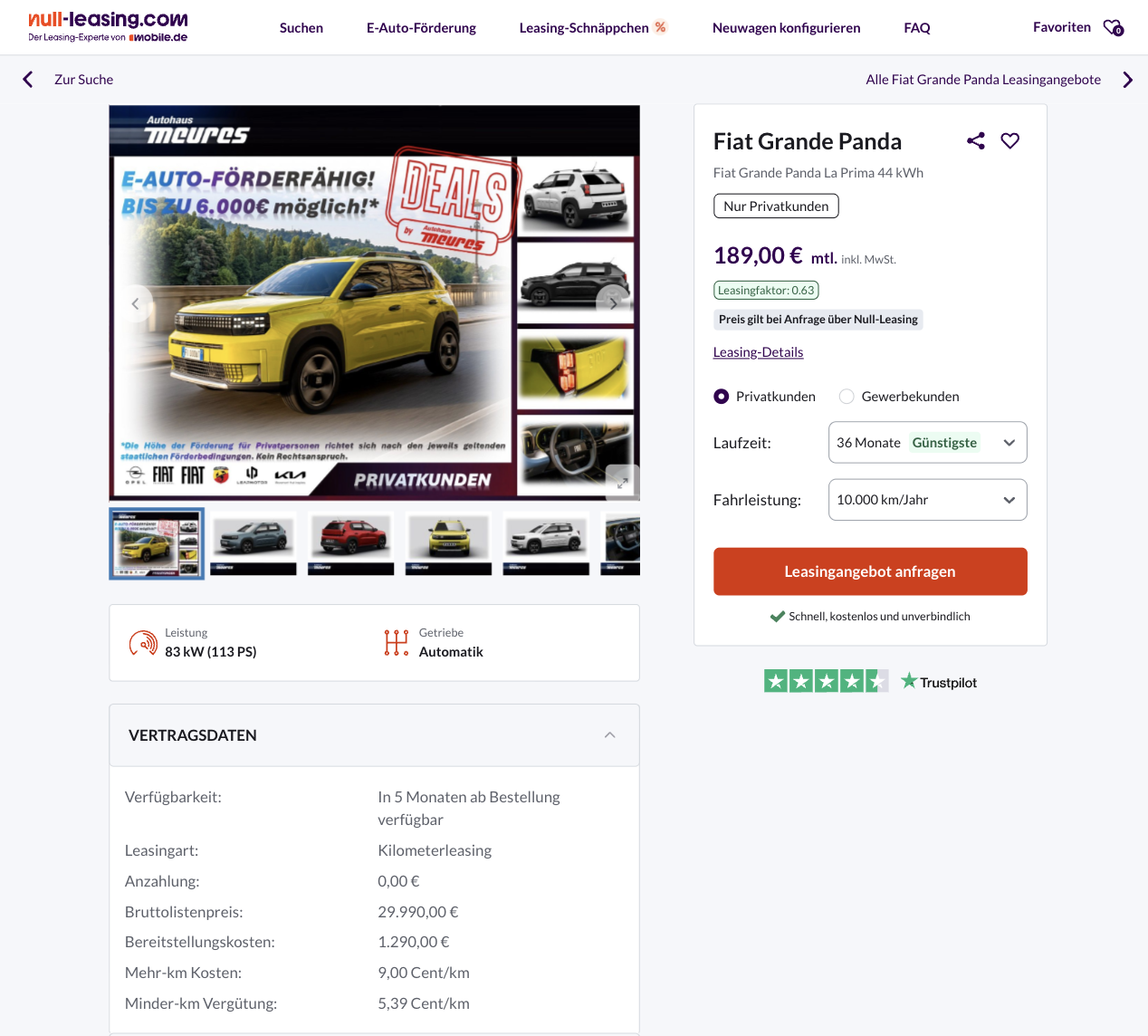 Der Fiat Grande Panda 44 kWh La Prima bei Null-Leasing für 189 Euro brutto im Monat zeigt ziemlich deutlich, wie attraktiv ein kompakter Stromer im Privatleasing heute sein kann. Besonders interessant, es fällt keine Sonderzahlung an. Die mögliche Umweltprämie kann selbst beantragt werden, ohne dass der Betrag vorher vorgestreckt werden muss. Dazu kommt eine Lieferzeit von nur rund fünf Monaten, obwohl es sich um ein frei konfigurierbares Bestellfahrzeug handelt.