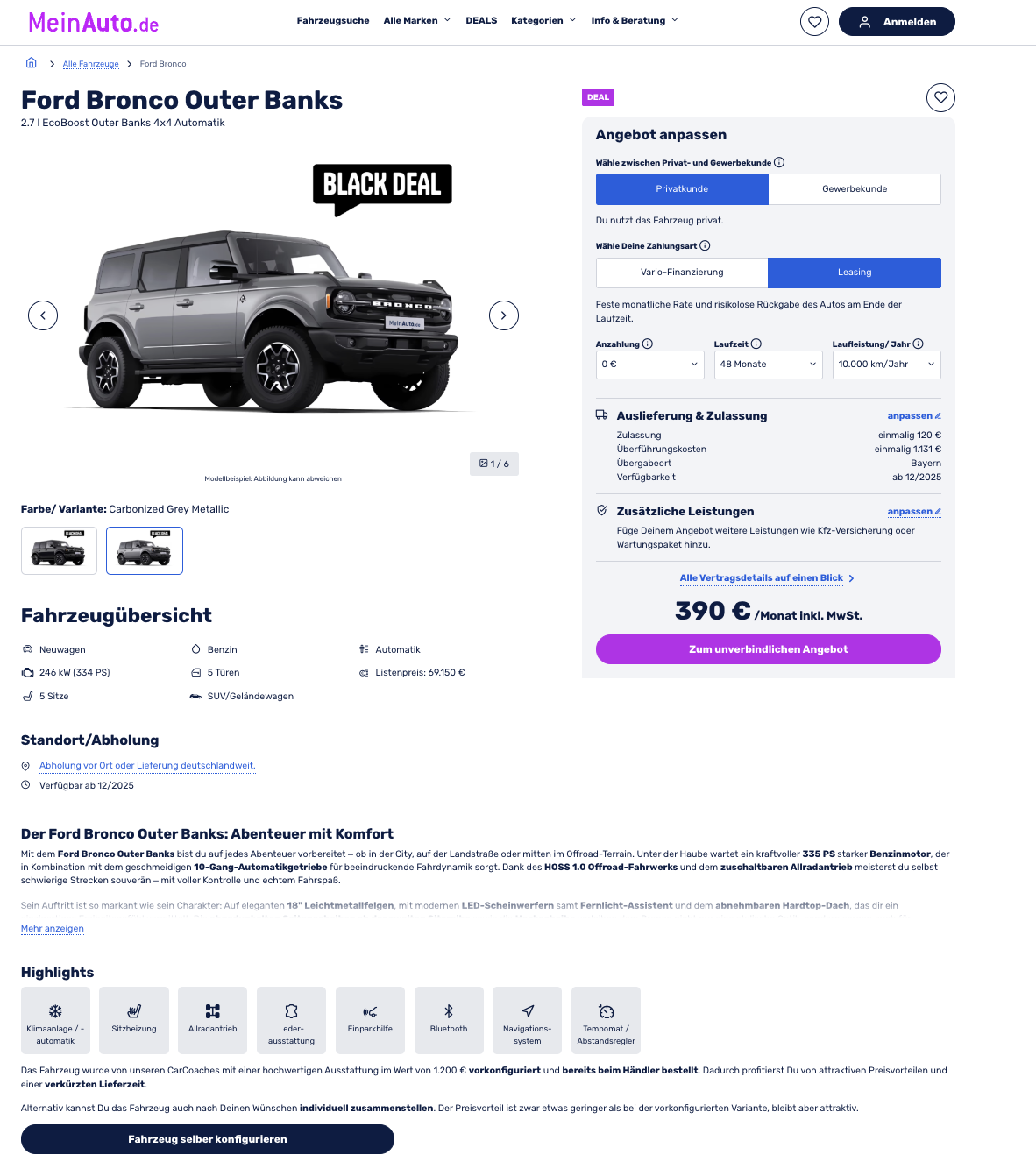 Black-Deal mit US Offroad Ikone bei MeinAuto! Den Ford Bronco 2.7 l EcoBoost Automatik 4×4 Outer Banks gibt es dort für 390 Euro brutto im Monat, ein echtes Kult-SUV auf deutschen Straßen. Das Angebot läuft im Rahmen des Black Deals, das Fahrzeug ist bereits bestellt und soll im Dezember 2025 verfügbar sein, was den Einstieg in die Bronco Welt planbar macht. Zur Wahl stehen Carbonized Grey Metallic oder Absolute Black Metallic, beide Farben unterstreichen den robusten Charakter deutlich.
